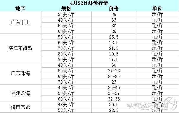 中國水產頻道報道,近期受各地對蝦存塘量、市場銷量、天氣變化這些影響,各個地區的對蝦塘邊價浮動變化較大。湛江東海島地區的冬棚蝦開始上市,但是量很少,蝦價相比上周稍漲0.5元/斤。據湛江東海島的業內人士預測,東海島的蝦價持續到5月中旬都會是保持平穩上漲的趨勢。廣東中山地區的蝦價跟上周基本穩定持平,價格無波動。廣東珠海地區的蝦價相比上周下跌4-5元/斤,價格下降幅度較大。福建龍海地區的蝦價相比上周上漲5-6元/斤。 4月22日廣東中山、湛江東海島、廣東珠海、福建龍海對蝦收購價格如下: |