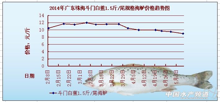 文/中國水產頻道張靜 中國水產頻道獨家報道,據悉,本周各地草魚存塘量少、市場銷售行情較好,草魚價格保持穩定上漲。本周黃顙魚價格受市場銷售量的影響,價格整體出現下滑。具體價格如下: 廣東中山地區的魚種相比上周上漲0.1元/斤,其它規格草魚價格跟上周持平。江蘇鹽城射陽地區除了4斤以上/尾規格的草魚價格跟上周一樣,其它規格草魚價格相比上周上漲0.4-0.6元/斤。上海地區5-7斤/尾規格的草魚價格相比上周上漲0.4元/斤。浙江湖州地區0.3斤/尾(新口)規格黃顙魚價格相比上周下降0.6元/斤,0.4斤/尾(老口)規格黃顙魚價格相比上周則下降0.8-1元/斤。廣東佛山地區0.4斤/尾規格黃顙魚價格相比上周下降1元/斤。浙江湖州地區的翹嘴紅鲌價格相比上周上漲0.4-0.6元/斤。 5月7日珠海斗門白蕉地區1.5斤/尾規格的海鱸價格是9元/斤,相比上周下降0.5元/斤。以下圖1是2014年2月-4月珠海斗門白蕉1.5斤/尾規格海鱸的價格表,圖2是2014年2月-4月珠海斗門白蕉1.5斤/尾規格海鱸的價格趨勢圖,由圖中可以看出3月下旬到4月份海鱸的價格就開始整體下滑。 圖2、2014年珠海斗門白蕉1.5斤/尾規格海鱸的價格趨勢圖 以下是2013年和2014年的珠海斗門地區的海鱸價格對比趨勢圖,圖中可以看出2014年海鱸的價格起步就比2013年的海鱸價格要高4-5元/斤,但是從2014年3月下旬開始出現較大幅度的下滑。 關鍵字: 草魚 黃顙魚 海鱸 水產養殖 中國水產頻道獨家報道,轉載請注明出處m.fuqitext.com! |