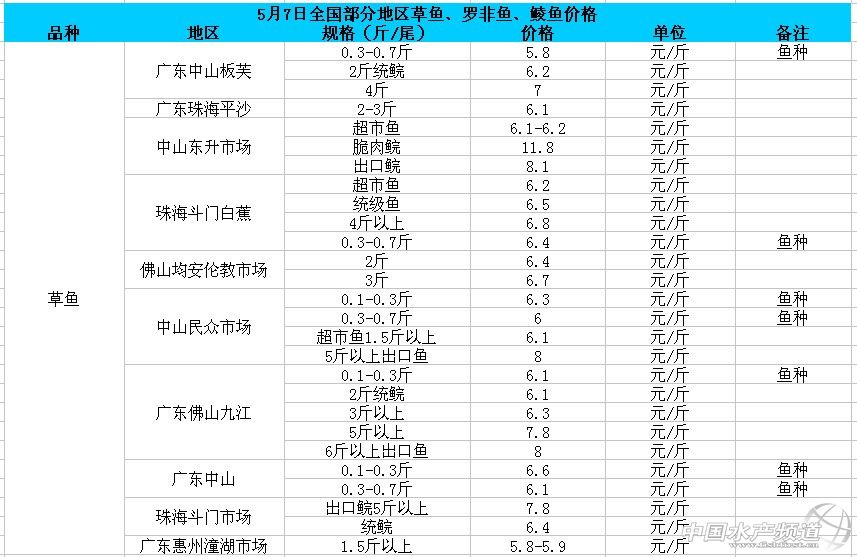 中國(guó)水產(chǎn)頻道原創(chuàng)報(bào)道,據(jù)業(yè)內(nèi)人士消息,5月7日全國(guó)部分地區(qū)草魚(yú)、羅非魚(yú)、鯪魚(yú)價(jià)格如下: (中國(guó)水產(chǎn)頻道水產(chǎn)價(jià)格信息共享Q群:245296163,歡迎提供各種水產(chǎn)品一線(xiàn)價(jià)格信息。 【關(guān)鍵字】:草魚(yú)價(jià)格 羅非魚(yú) 鯪魚(yú) 中國(guó)水產(chǎn)頻道獨(dú)家報(bào)道,轉(zhuǎn)載請(qǐng)注明出處m.fuqitext.com! |