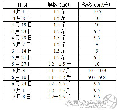 文/中國水產(chǎn)頻道 沈基文 中國水產(chǎn)頻道原創(chuàng)報道,較上周相比,本周1.2—1.5斤/尾規(guī)格的海鱸價格還是保持在9.5元/斤左右,其他規(guī)格的海鱸比上周價格漲了0.3元/斤左右。據(jù)中國水產(chǎn)頻道了解,目前1斤至1.2斤規(guī)格的海鱸在市場行情比較理想,在前半個月海鱸各種規(guī)格價格平穩(wěn)之后,海鱸價格現(xiàn)已開始漲了,但是這次漲價的周期和未來的走向還是需要由市場決定,目前無法估測。 下圖是珠海斗門白蕉海鱸價格自2014年2月8日起到今天(7月8日)的每周趨勢圖: 下圖是今天(7月8日)珠海地區(qū)斗門白蕉海鱸的具體價格: 從2014年4月截至到今天(7月8日)為止,珠海斗門白蕉海鱸的具體價格分別是: 中國水產(chǎn)頻道獨家報道,轉(zhuǎn)載請說明出處m.fuqitext.com ,違者追究法律責(zé)任, 謝謝合作。 【關(guān)鍵字】:海鱸 價格 水產(chǎn)養(yǎng)殖 |