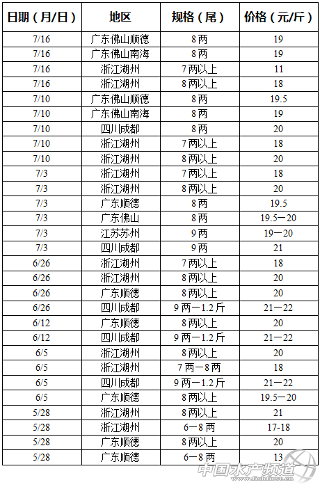 下圖是自5月28日到今天(7月16日)部分地區加州鱸價格明細: