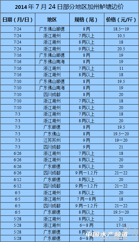 2014年7月24日部分地區加州鱸塘邊價