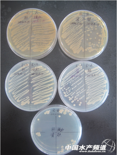 文/圖 利洋研究所 雷燕 張文文 利洋水產藥店潭牛店 姚勇 圖1 養殖池塘基本情況 中國水產頻道獨家報道,海南省文昌市潭牛鎮一羅非魚養殖池塘,面積15畝,水深2.5米,1臺增氧機(見圖1),2013年12月一次性放規格17尾/斤的羅非魚4.5萬尾,目前規格6-7兩/尾。 2014年5月1日出現死亡,死魚15尾,用解毒劑(主要成分:黃腐酸、海洋生物生長素、月桂基氨基酸)解毒,同時減料。 5月2日,死亡30尾。 5月3日,死亡130尾。 5月4日,死亡200尾;用硫代硫酸鈉解毒降氨氮。 5月5日,死亡200尾。 5月6日,死亡200尾。 5月7日,死亡240尾。 5月8日,死亡300尾。 5月9日,死亡220尾。 5月10日,死亡160尾,下午3點到現場,測定水溫32℃,簡易試劑盒測水質指標:pH值8.7,亞硝酸鹽0.3mg/L,氨氮0.4mg/L。從塘中取1尾剛死的羅非魚,體表出血,鰓蓋“開天窗”(圖2)。解剖見爛鰓,鰓上附泥,肌肉出血發紅,有腹水,肝臟呈土黃色(見圖3),脾臟呈暗黑色,腸道空虛,膽囊高度充盈,腎臟有少量出血。分別從腹水、肝臟、腎臟和腦接種到腦心浸液培養基進行細菌分離培養。 圖2 10日從塘中取的剛死的魚 圖3 病魚爛鰓,全身肌肉發紅,腹腔有腹水,肝臟呈土黃色 圖4 11日的發病魚體表出血 圖5 病魚爛鰓,鰓上附著泥 圖6 病魚有腹水,花肝,空腸,出血,膽囊腫大 圖7 病魚脾臟腫大,呈暗黑色 圖8 病魚腎臟出血 圖9 病魚腦有大量出血點 圖10 病魚細菌分離培養情況 圖11 分離菌的革蘭氏染色結果 圖12 分離菌的藥敏實驗結果 5月11日,死魚175尾,早上客戶從塘中取2尾魚送檢,其中一尾病魚體表出血(見圖4),解剖見病魚爛鰓,鰓上附著泥土(見圖5),腹腔有腹水,花肝,空腸,出血,膽囊嚴重充盈(見圖6),脾臟腫大,呈暗黑色(見圖7),腎臟出血(見圖8),腦部有大量出血點(見圖9)。另一尾是沒發病的正常魚。分別從腹水、肝臟、腎臟和腦中接種腦心浸液培養基進行細菌分離培養。經24小時培養,病魚各接種組織在培養皿上均長出圓形、邊緣整齊、隆起、表面平滑,灰白色不透明的菌落(見圖10),革蘭氏染色呈陰性、兩端鈍圓的短桿菌(見圖11),經16S rDNA測序鑒定為嗜水氣單胞菌。正常魚未分離出大量細菌。對分離菌分別進行藥敏試驗,結果顯示,分離菌對“出敗康”(主要成分:恩諾沙星)、“鰓皮腸利康”(主要成分:諾氟沙星、鹽酸小檗堿)、“鰓膚康”(主要成分:氟甲喹)、“氟多力”(主要成分:氟苯尼考)、“菌炎好迪”(主要成分:鹽酸多西環素)、“腸苷康”(主要成分:硫酸新霉素)等藥物敏感(見圖12)。 5月11日上午10:00用“氧速保”(主要成分:活性氧≥10%)5瓶調水增氧。 5月12日,死亡150尾。 5月13日,死亡90尾。 5月14日,早上死亡50尾,測水pH值8.3,氨氮和亞硝酸鹽測不出,下午死亡65尾。 5月15日,早上死亡45尾,用聚維酮碘消毒。 5月16日,死亡45尾。 5月17日,早上死亡20尾左右,之后每天死10尾左右,23號以后每天死亡2~3尾,病情得到控制。 分析:1、細菌性敗血癥是淡水魚類的主要疾病,也是池塘養殖羅非魚的重要疾病,今年上半年從海南、云南等地發病羅非魚分離到細菌經鑒定仍然以氣單胞菌為主。 2、本病例發病前期,當時海南長期陰雨天氣,水質不穩定,氨氮、亞硝酸鹽偏高,是羅非魚發生細菌性敗血癥的重要誘發因素。 3、通過水質調控,改善水環境和外用消毒劑控制細菌數量可以控制慢性細菌性敗血癥的死亡,但是死亡數量下降緩慢,本病例在發病初期如果及時配合抗菌藥物內服可能很快降低死亡量,減少損失。 中國水產頻道獨家報道,轉載請說明出處《水產前沿》雜志 m.fuqitext.com ,違者追究法律責任, 謝謝合作。 【關鍵字】:羅非魚 病害 水產養殖 |