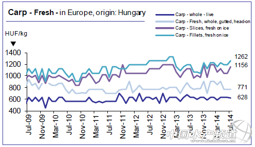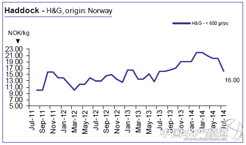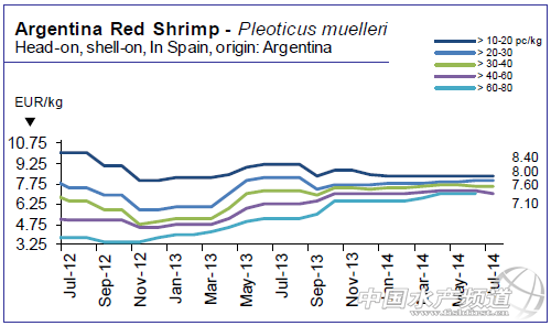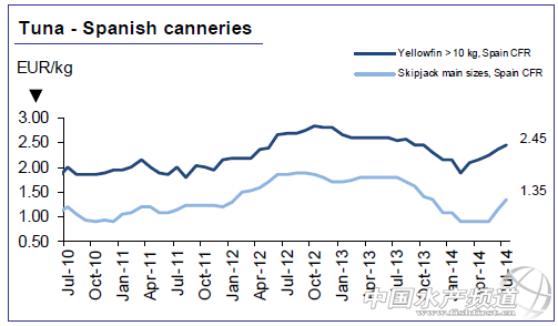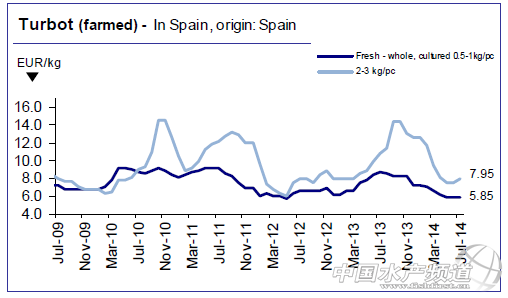 受惡略天氣和基里巴斯漁船作業天數計劃(Vessel Day Scheme,規定在每年的特定日子里才能出海捕撈)的影響,太平洋中西部金槍魚的捕撈量減少。與此同時,中西太平洋漁業委員會實施的為期四個月的FAD漁業政策從7月1日開始實施。受此影響,曼谷的鰹魚價格上漲較快,CFR價格從1750美元/噸漲到1780美元/噸。 東太平洋的金槍魚捕撈情況較好。由于厄爾尼諾現象影響對天氣的影響得到了改善,因此金槍魚捕撈工作進展順利。從7月29日開始,為期兩個月的美洲間熱帶金槍魚委員會實施的禁漁期結束。在禁漁期間,東太平洋一半以上的漁船不能出海作業。禁漁期間,曼塔(厄瓜多爾港口城市)的鰹魚和黃鰭金槍魚的船上交貨價份上漲到了1650美元/噸和2400美元/噸。 盡管6月份印度洋的金槍魚捕撈情況有所改觀,但是7月份的整體捕撈情況依然不盡如人意。在捕撈上岸的金槍魚中,大部分是黃鰭金槍魚和大眼金槍魚,而當地加工廠所需的鰹魚上岸量非常少。印度馬埃地區的鰹魚離岸價格已經漲到了1350歐元/噸,黃鰭金槍魚價格上漲到了2300歐元/噸。 大西洋地區的金槍魚捕撈情況也不是很樂觀,當地的金槍魚加工商身處原料短缺的窘境。科特迪瓦首都阿比讓的鰹魚和黃鰭金槍魚的船上交貨價格分別上漲到了1300歐元/噸和2200歐元/噸 由于印度洋和大西洋的捕撈情況都不盡人意,因此歐洲市場(西班牙)上的鰹魚和黃鰭金槍魚的CFR價格分別上漲到1350歐元/噸和2450歐元/噸。 小型中上層魚類 圖15 意大利市場海鱸魚和海鯛魚價格走勢圖(產地:希臘) 截至目前,受厄爾尼諾現象的影響,秘魯的鳀魚捕撈量之后147萬噸,遠遠低于253萬噸的捕撈配額。目前只完成捕撈配額的58%,在距離第一季鳀魚捕撈結束只有短短的幾天時間的情況下,已經不可能完成253萬噸的捕撈配額。 目前還不確定下半年的厄爾尼諾會有怎樣的變化,但是目前的海水溫度已經恢復了正常。從目前看來,歐洲的魚粉(主要成分是鳀魚)買家停止購買魚粉處于觀望狀態,等待魚粉價格的下調。 Holtermann報告表明,丹麥沙鰻捕撈即將結束,目前的捕撈量已經達到了200186噸。由于鯡魚的捕撈時間一般在每年的8、9月份,因此現在還沒有鯡魚的捕撈情況報告。目前冰島鯖魚的捕撈量為12906噸,低于134784噸的捕撈配額。捕撈到的鯖魚大部分直接銷售給消費者食用。7月初,挪威漁業部宣布,冰島毛鱗魚夏季捕撈正式開始。7月11日,挪威18艘漁船共計捕撈到16234噸冰島毛鱗魚。冰島毛鱗魚的捕撈配額初步設定為225000噸,只有預測捕撈配額的一半左右。冰島毛鱗魚的最終捕撈配額將在今年秋冬季節被確定。今年挪威魚飼料的銷售情況一直較好,目前的銷量已經達到了569926噸與2013年同期的456962噸相比增加了25%。 據挪威海洋局消息,今年上半年挪威中上層魚類的出口額為26億克朗,與2013年同期相比增加了1%。其中,鯡魚的出口額減少了10%,而鯖魚的出口額增加了41%。 在海參崴批發市場,太平洋鯡魚的價格比較穩定而市場需求量卻相對較弱。規格為200-300克/條的太平洋鯡魚價格從15盧布/千克上漲到18盧布/千克,規格大于300克/條的太平洋鯡魚價格從21盧布/千克上漲到23盧布/千克。春季鯡魚(5月份捕撈上岸)是莫斯科批發市場上最便宜的水產品種。現在莫斯科批發市場上鯡魚價格在25-26盧布/千克左右,和海參崴批發市場一樣,鯡魚的市場需求量同樣較少。 頭足類 從7月份開始,南非實行的三個月的墨魚禁漁期已經宣告結束。據報告,7月份的墨魚捕撈量相對較少。目前,市場上的墨魚價格很難預測,因為在接下來的幾周,墨魚的捕撈量將會增加。 甲殼類 從6月30日開始,加拿大龍蝦捕撈季宣告結束。加拿大龍蝦春季捕撈時間是從5月到6月,在這兩個月的時間里,加拿大龍蝦價格一直保持穩定,沒有出現較大的漲跌幅。 受天氣狀況較好、捕撈產量增多的影響,歐洲地區的甲殼類產品的價格持續下跌。 三文魚 在5月下旬的三文魚(整條冰鮮大西洋三文魚)價格跌破了40克朗/公斤之后,7月份的三文魚價格繼續下跌。水溫較好加速了三文魚的生長,三文魚的市場供給量增加,6月底的三文魚價格已經跌破了30克朗/公斤。特別是一些大規格三文魚,其價格下跌幅度較大。然而在7月上旬,三文魚的市場供給量發生了變化。為了三文魚的可持續發展,7月份的三文魚捕撈量開始減少。7月份三文魚的價格止跌回升。盡管今年大西洋三文魚的養殖量增加了7-8%,但是三文魚的價格有望在年底回升到40克朗/公斤。最近挪威海洋局表示,三文魚市場還存在巨大的的發展潛力,為確保三文魚產業的發展應增加世界各國人民對三文魚營養價值的認識。據挪威海洋局發布的消息,6月份三文魚的出口額為33億克朗,與去年同期相比增加了14%,出口量為8.4萬噸,比去年同期增加了22%。今年上半年挪威三文魚的總出口額為215億克朗,創造了新的紀錄。歐盟、亞洲和美國是挪威三文魚的主要出口對象。 鱒魚 由于三文魚的價格一直處在高位,所以消費者把消費矛頭轉向了鱒魚,尤其是在俄羅斯。挪威是歐洲鱒魚的主要生產國,今年上半年的鱒魚出口量與2013年相比增加了22%,出口總額為12億克朗,其中6月份的出口額就達到了1.82億克朗。今年鱒魚的需求一直比較大,所以今年的鱒魚價格要明顯高于2013年。 淡水魚 目前淡水魚總體價格處于下跌的趨勢。 由于需求量的減少,羅非魚的價格大幅下跌,目前已經接近歷史最低水