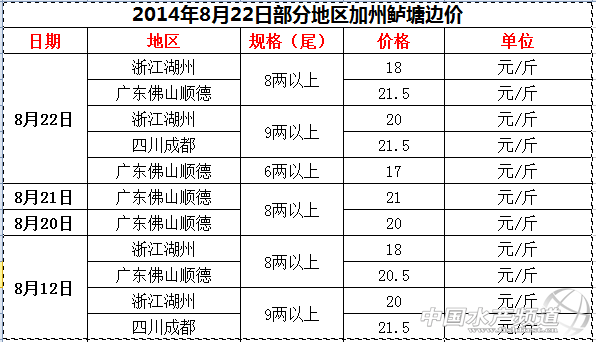 文/中國水產(chǎn)頻道 沈基文 中國水產(chǎn)頻道原創(chuàng)報道,下圖今天(8月22日)全國部分地區(qū)的加州鱸具體價格表格,從表中可以看出本周出浙江湖州地區(qū)和四川成都地區(qū)的價格沒與變化之外,加州鱸的價格在廣東佛山順德地區(qū)有變化,據(jù)順德地區(qū)的聶先生介紹,近幾天加州鱸的價格平均每天漲0.5元/斤,在舊魚的存塘量越來越少的情況,近幾天新魚占加州鱸上市量的60%,新魚6兩以上的價格在17元/斤左右,而隨著中秋佳節(jié)的即將到來,新魚會大量上市,屆時價格也會繼續(xù)上漲。以下是具體數(shù)據(jù): 中國水產(chǎn)頻道(m.fuqitext.com)獨家報道,轉(zhuǎn)載請說明出處,違者追究法律責(zé)任, 謝謝合作。 【關(guān)鍵字】:加州鱸價格 中秋節(jié) 水產(chǎn)養(yǎng)殖 |