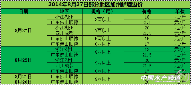 文/中國水產頻道 沈基文 中國水產頻道原創報道,下圖今天(8月27日)全國部分地區的加州鱸具體價格表格具體數據: 中國水產頻道(m.fuqitext.com)獨家報道,轉載請說明出處,違者追究法律責任, 謝謝合作。 【關鍵字】:加州鱸價格 中秋節 水產養殖 |