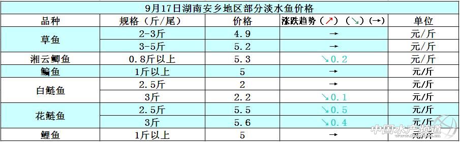 中國水產頻道原創報道,據網友提供消息,下圖就是9月17日湖南安鄉地區部分淡水魚的塘頭價: