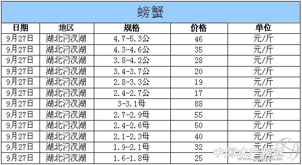 中國水產頻道獨家報道,據網友提供消息,2014年9月27日湖北汈汊湖主產區河蟹價格行情如下: 湖北漢川汈汊湖河蟹信息由湖北漢川天歌螃蟹養殖專業合作社曾先生(13508632620)提供,由于價格波動及訂貨量影響,以上價格為行情價格,實際價格請聯系電話。 |