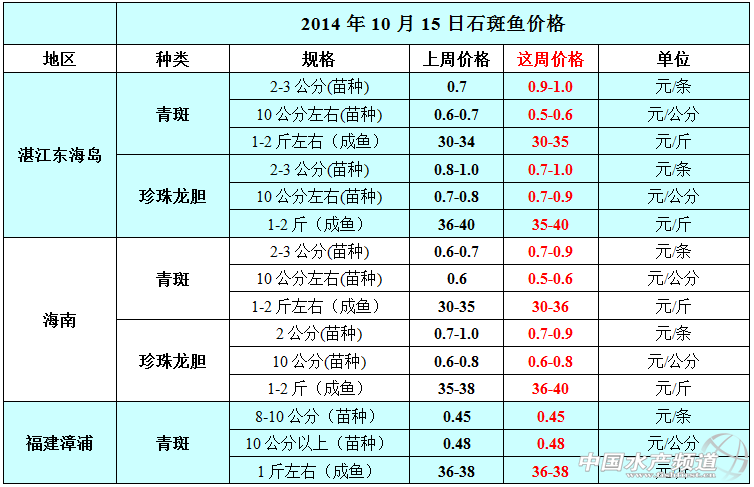 | 文/中國水產(chǎn)頻道 周雙艷 中國水產(chǎn)頻道原創(chuàng)報(bào)道,以下是湛江東海島、海南和福建漳浦地區(qū)石斑魚魚苗和成魚的價(jià)格。 這周湛江東海島地區(qū)青斑小苗上漲0.2-0.3元/條,中苗則下降0.1元/公分。成魚和珍珠龍膽價(jià)格波動不大,基本不變。海南地區(qū)青斑小苗也上漲了0.1-0.2元/條,中苗和成魚價(jià)格基本不變;而珍珠龍膽則是小苗和中苗價(jià)格基本不變,成魚上漲1-2元/斤。福建漳浦石斑魚價(jià)格則和上周一樣,價(jià)格不變。(以上價(jià)格及觀點(diǎn)僅供參考) 【關(guān)鍵字】: 石斑魚 石斑魚價(jià)格 石斑魚養(yǎng)殖 。中國水產(chǎn)頻道水產(chǎn)價(jià)格信息共享Q群:245296163,歡迎提供各種水產(chǎn)品一線價(jià)格信息,聯(lián)系QQ:1772358095) |