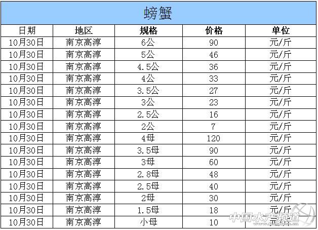 摘要: 2014年10月30日江蘇高淳河蟹價格行情如下: