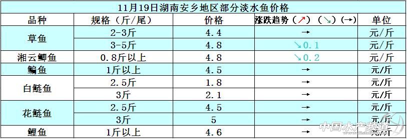 中國水產頻道原創報道,據網友提供消息,下圖就是11月19日湖南安鄉地區部分淡水魚的塘頭價: