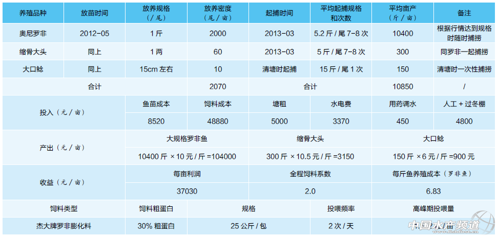 文/佛山市南海區杰大飼料有限公司 汪福保 程光兆 中國水產頻道獨家報道,由于大規格羅非魚對養殖技術要求較高,同時具有養殖周期長、投入大、風險高、效益高等特點,市場養殖量并不大,主要集中在珠海、佛山等地。近幾年大規格羅非魚一直保持較好的行情,只要掌握了相應的技術就可以獲得較好的回報。本文比較了普通規格羅非魚(1斤以上)和大規格羅非魚(4斤以上)養殖模式的差異,并總結了大規格羅非魚養殖過程中的關鍵技術,為行業提供一種新的羅非魚養殖方法。 圖為6斤左右的大規格羅非魚 一、兩種規格羅非魚養殖模式和效益對比 從養殖模式上看,二者之間還是有比較大的差別,主要體現在大規格羅非魚養殖周期長、產量高、有過冬要求等(如表1)。但在養殖效益上,大規格羅非魚遠高于普通羅非魚(如表2),一方面是由于大規格羅非魚后期生長速度明顯加快,規格達到1斤以后的月生長速度可達6兩以上,生長潛力大;另一方面,近幾年大規格羅非魚一直保持較好的行情(見圖1)。 二、大規格羅非魚養殖過程中的關鍵環節 1、放苗前的準備工作 主要分為曬塘、清淤、毒塘、消毒、肥水等步驟,按照常規魚養殖的方法操作即可。這些基礎工作對養殖成敗至關重要,操作得當可明顯減少病害,水質調節也相對容易。 2、苗種選擇 為降低養殖風險,最好選擇抗病力強的奧尼羅非魚種,在積累了養殖經驗和養殖條件較好的情況下也可選擇吉富品種。 (1)選擇1斤以上羅非魚可充分利用其后期生長速度快的特點,提早上市。但切忌選擇患過鏈球菌等疾病的魚,表現為魚群的顏色不均勻、活力差、粘液少、長速慢,特別是出現魚體發黑,塘邊有獨游不聚群吃料的魚,切不可購買。可通過附近養殖戶或詳細咨詢養殖細節來確定,最好通過打樣解剖了解魚的健康狀況。 (2)選擇朝苗下塘前必須清塘、消毒,通過毒性檢測后才可放入。池塘沒有清塘,或者含有雜魚最好不要放入12朝以下的羅非魚苗,否則成活率很低。羅非魚苗種造假、摻假很容易,好苗、差苗在12朝以前一般人難以分辨,這就給某些廠家提供了以次充好的機會。選擇好的苗種廠家,如廣東省內十大羅非魚苗場均可,不可圖便宜選擇一些山寨廠家,這樣得不償失。最好選擇頭苗,即同一批苗里規格大的個體,養殖規格越大優勢越明顯,能達到事半功倍的效果。不要選擇過冬苗,這些魚體質基本上都比較差,應親自到苗場選購,看看苗場的規模和實力,選擇個體大小、身體顏色均勻一致的苗。魚苗成群游動,攪動水體,魚苗能迎著水流快速游動。將魚苗撈起,能在盆中狂跳,背肉厚,身體鱗片完整的苗是好苗;反之,那些在盆中很少跳動、背肉薄(俗稱“癟子”)、鱗片不完整的是差苗,生長速度慢。 3、水質調控 在高密度、高產量的羅非魚養殖模式下水質非常容易惡化,做好水質調控工作十分重要。“開增氧、常調水、少殺菌、多殺蟲”是維持好水質的關鍵。增氧機按1-1.5畝/臺設置,晴天白天開一半,晚上全開。采用枯草芽孢桿菌和EM菌(乳酸菌為主)類產品每10天調水一次。通過堅持定期調水,使pH、氨氮、亞硝酸鹽等指標維持在正常范圍內,水體透明度保持在10-15 cm。正常情況下不殺菌,不要選用強氯精、漂白粉等刺激性強的藥物。堅持一個月殺一次蟲,可采用敵百蟲加滅蟲精,能減少浮游動物耗氧,維持良好的水環境。 4、投喂優質飼料 羅非魚高密度養殖條件下對飼料質量要求很高,同時飼料成本占到了養殖成本的70%,因此選擇好飼料很關鍵。除了向其他養殖戶打聽飼料養殖效果外,最重要的還是自己使用出來的實際效果。通過養殖過程中仔細觀察魚的長勢、定期打樣稱重來確定飼料效果。一般來說, 1斤以上的羅非魚在生長旺季月增重可達6兩以上。飼料方面盡量選用膨化料,投喂量根據魚的攝食情況靈活掌握,以20分鐘左右吃完、不剩料、無死魚為準。建議劃船在魚塘中間投喂,方便觀察魚的吃料情況。 5、病害防治 鏈球菌病是羅非魚養殖過程中最為棘手的病害,既感染腦部,破壞腦神經,又損壞肝、腎等器官,影響魚體的自身免疫機能,而且目前流行的鏈球菌對大部分常規抗菌藥均有不同程度的耐藥性,治療起來十分困難。因此該病以預防為主,用藥治療為最后的選擇。根據經驗我們推薦如下防病措施: (1)堅持調水:建議選用芽孢桿菌加EM菌,高溫夏季每月4次,春秋季每月3次,冬棚每月4次,定期全塘潑灑,結合每月一次晶體敵百蟲加滅蟲精潑灑,同時防蟲。(2)科學投喂:盡量選擇優質膨化料。膨化料粉塵少、消化率高,對水體有一定保護作用,而且容易觀察魚的攝食情況,不會造成浪費。投喂量視水質及魚的健康狀況而定,原則上保持羅非魚食欲旺盛,不能有剩料,不會有死魚出現。如發現這餐比上餐吃得慢,有連續死魚或死魚數量上升,則及時減少投喂或停喂。(3)保持溶氧充足。 推薦治療措施:(1)停料消毒:停料2-3天,同時使用二氧化氯等溫和型消毒劑對魚塘進行消毒。(2)內服藥物治療:按每噸飼料添加量計算,磺胺嘧啶(1600克)+飼料級維生素K3(100克)+飼料級牛磺酸(1000 g)+益肝寶(1000 g)(主要成分為膽汁酸),連用兩周,前三天藥物用量加倍并足量投喂。該病受多方面因素影響,治療時開足增氧機,多調水,先停料消毒、再拌藥內服,缺一不可。 6、二代羅非魚的控制 羅非魚養殖過程中大量出現二代羅非魚是一個十分頭疼的問題。首選要從源頭上控制,