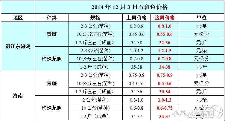 | 文/中國(guó)水產(chǎn)頻道 周雙艷 中國(guó)水產(chǎn)頻道原創(chuàng)報(bào)道,以下是湛江東海島和海南地區(qū)石斑魚魚苗和成魚的價(jià)格。 由于最近珍珠龍膽成魚上市比較多,導(dǎo)致青斑成魚價(jià)格有點(diǎn)下調(diào),下降2-4元/斤,珍珠龍膽小苗供不應(yīng)求,珍珠龍膽的小苗上漲了0.2-0.3元/尾。(以上價(jià)格及觀點(diǎn)僅供參考) 【關(guān)鍵字】: 石斑魚 石斑魚價(jià)格 石斑魚養(yǎng)殖 (中國(guó)水產(chǎn)頻道水產(chǎn)價(jià)格信息共享Q群:245296163,歡迎提供各種水產(chǎn)品一線價(jià)格信息,聯(lián)系QQ:1772358095) |