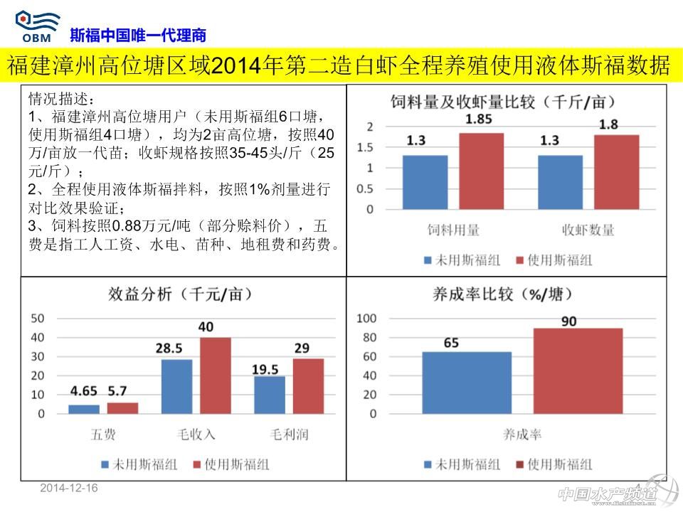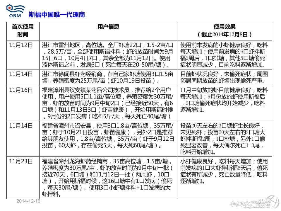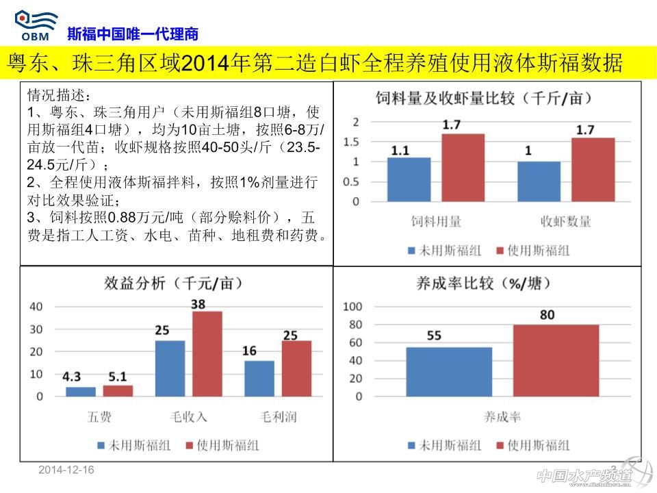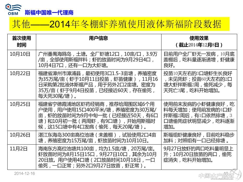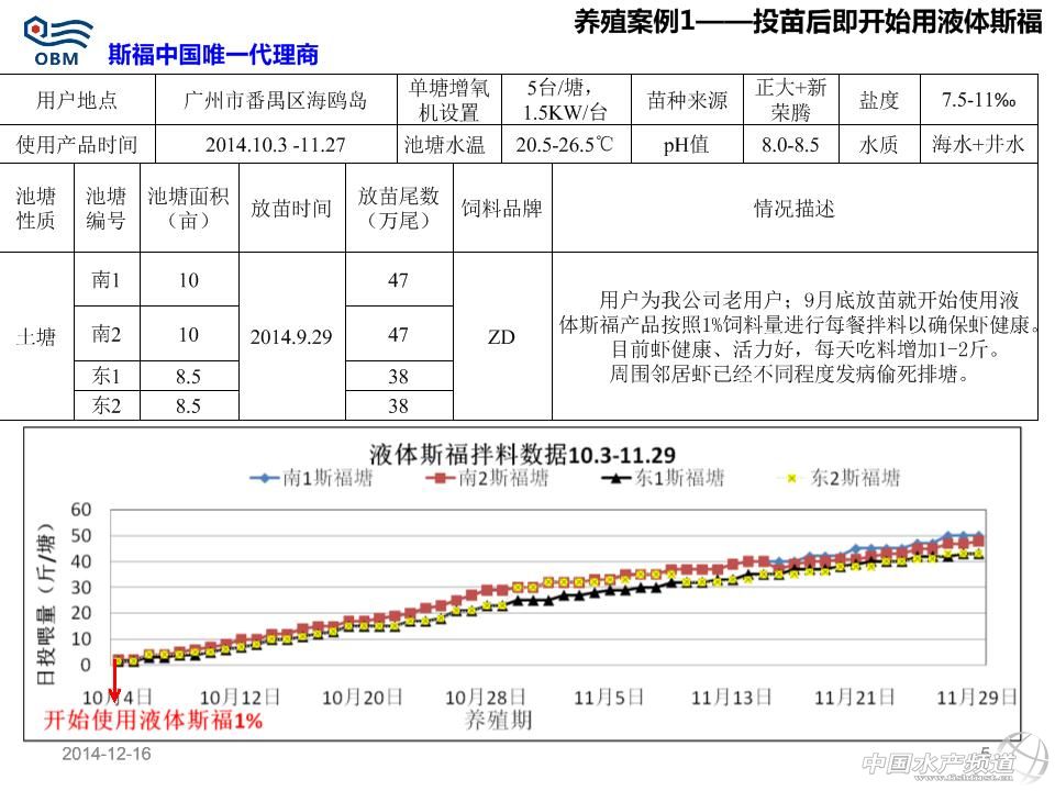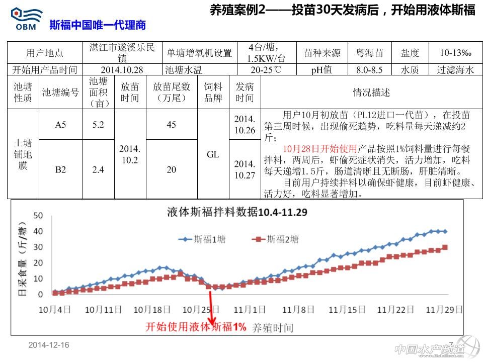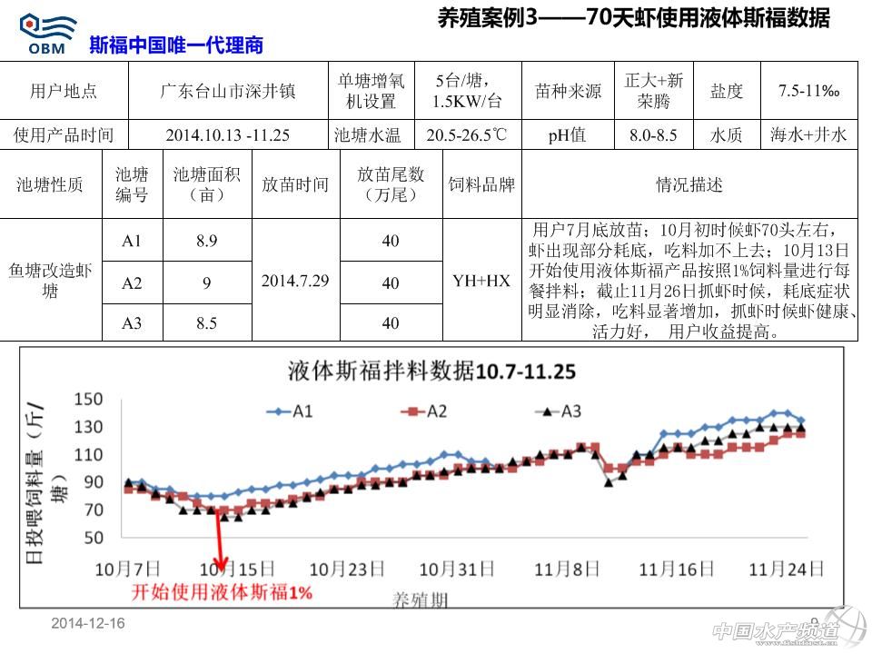 短中鏈脂肪酸單甘油酯(商品名:斯福)用于防治對蝦偷死及白便效果數據 溫馨提示:文中部分內容以圖片形式呈現! 本文主要分享了粵西、廣西、粵東、珠三角及福建漳州等地區對蝦養殖狀況,其中很多數據值得我們去分析。同樣,本文也涉及到在蝦病暴發時,使用“斯福”產品所帶來的改變。 2014年冬棚蝦拌料液體斯福效果 液體斯福產品提高對蝦健康度,從而提高蝦的采食量(每天遞增1-2斤)、體重增加和生長速度;液體斯福產品可使對蝦從偷死病及白便病得以恢復,但不同地區用戶反映的效果不同與操作方法及蝦病嚴重程度有關;數據證實液體斯福產品每天持續使用且使用時間越長越有助于提高蝦良好體質的提高。 標準使用方法 使用量為每餐飼料量的1%,即10公斤/噸飼料,全程每餐拌料使用。目前包裝為20kg/桶。 以每餐喂1斤飼料為例,具體步驟如下(嚴格按照步驟順序操作): 1、稱取0.1兩斯福(5g,約1/5斯福的瓶蓋)與1兩水(50g)混合為水溶劑; 2、將上面的水溶劑放到干凈盆里并與1斤飼料混勻,晾5-10分鐘; 3、稱取0.1兩豆油(5g,約1/4豆油的瓶蓋)與0.5兩水(25g)混合為水溶劑,然后與上面的半干燥的1.1斤飼料混勻,晾20-30分鐘到干燥,然后去投喂。 注意事項: 斯福自帶的的瓶蓋子滿瓶蓋為0.5兩(25g)。豆油自帶的瓶蓋為0.25兩(12.5g)左右。礦泉水滿瓶約1斤(500g)左右,用戶拌料開口粉料時候,上述水適當增加一倍;產品每次使用后注意擰緊瓶蓋,并保存在陰涼干燥地方;可以提前一天拌第二天全天所用的飼料并晾干過夜,以減少每餐拌料工作量;飼料投喂時,不允許再次加水到飼料后進行潑撒投喂,而應直接干撒投喂飼料。 市場用戶常見的操作不規范現象-1:投喂拌料斯福并晾干的飼料的時候,再次加水進行投喂 誤區:認為潑撒飼料時候不再加水,會使飼料漂浮在池塘水表面,從而造成浪費且污染水體 正確做法為:直接潑撒投喂,若再加水會使之前拌的油和飼料分開,從而斯福(親水)溶解一部分在水里;無論粉狀飼料還是開口料都是顆粒,飼料加水后已使飼料表面張力擴大,且飼料密度大于水,投撒池塘后,最多20分鐘就會下沉(浮性膨化料除外)。 市場用戶常見的操作不規范現象-2:直接分別把斯福和水倒在盛有飼料大盆的角上進行拌料 誤區:認為比較省事 正確做法為:按照規定稱取斯福和水進行混合,并務必攪拌均勻為水溶劑;稱取對應的飼料,然后把上述的水溶劑加入飼料后拌勻;拌勻過程中,尤其是拌料開口粉料會有結塊現象,應該認真把小塊都揉開,否則飼料局部的斯福量根本不均勻;如果需要添加內服藥(保肝、治療腸炎、VC等),也應該與斯福產品及水同步混勻;添加的藥物如果是液體的應同時減掉稀釋斯福的水的用量;上述步驟混勻揉開所有小結塊后,晾干10分鐘以上;開口粉料拌料時候水酌情增加,但不宜過多,否則更易結塊。 市場用戶常見的操作不規范現象-3:直接把斯福、水和豆油簡單混合后與飼料拌料 誤區:認為比較省事 正確做法為:按照規定稱取斯福和水進行混合,并攪拌均勻為水溶劑;稱取對應的飼料,然后把上述的水溶劑加入飼料后拌勻,確保沒有任何小的結塊;上述步驟混勻揉開所有小結塊后,晾干10分鐘以上;按照規定稱取豆油和水稀釋后,快速逐漸噴灑到上述的飼料,并拌勻,確保沒有任何結塊;最佳的做法是頭一天晚上把第二天全天所用的飼料全部拌料,晾干一晚上,第二天每餐使用時直接去干撒投喂。 市場用戶常見的操作不規范現象-4:不持續使用產品 誤區:認為斯福產品是治病的藥物,蝦發病時候加數倍量去用就可以快速治病,平時蝦健康時候不用,覺得浪費錢 正確做法為:斯福產品是一種飼料添加劑,屬于營養性添加劑,不是藥物范疇,不會像某些藥物那樣產生抗藥性;日常堅持每天使用,對預防蝦發病具有很好的作用;即使發病的蝦開始用產品,不建議增加數倍量,未必效果顯著,可以增加一倍量,每天每餐按照操作使用,一般2周內均不同程度有明顯改善現象;且產品本身為脂肪酸類范疇,可以提供能量給蝦。 市場用戶常見的操作不規范現象-5:發病蝦塘不注重合理使用科學方法去改善水質環境 誤區:發病后,加數倍量去用各種藥物喂蝦,且大量外潑藥物,認為可以快速治病,平時蝦健康時候不用,覺得浪費錢 正確做法為:傳統意識上是藥三分毒,長期用藥均會產生抗藥性;但是目前蝦發病往往和水質惡化有很大關系;日常應每周注重藻菌相平衡;使用益生菌類產品調控水質;對于發病的蝦塘,用戶在使用斯福內服時候,應該增加水質調控(勿用刺激性強藥物消毒,而應該給其解毒和平緩處理)。(中國水產頻道獨家報道,轉載請注明出處!) 【關鍵字】:南美白對蝦 白便 偷死 水產養殖 |