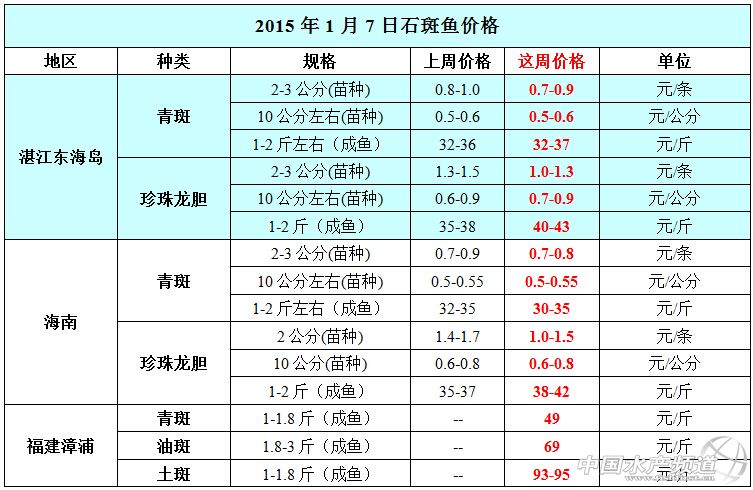 這周石斑魚魚苗價格波動不大,湛江2-3公分的苗下降了0.1元/條,10公分的魚苗價格不變,海南青斑價格基本不變;湛江珍珠龍膽2-3公分的魚苗上漲了0.2-0.3元/條,10公分的苗上漲了0.1元/公分,但海南2-3公分的魚苗下降了0.2-0.4元/條。這周石斑魚成魚價格有所上漲,其中湛江青斑成魚上漲了1元/斤;珍珠龍膽成魚上漲了2-8元/斤,海南珍珠龍膽成魚上漲了1-7元/斤。(以上價格及觀點僅供參考)