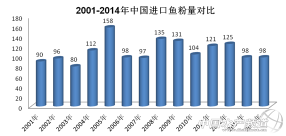 2.4 2001-2014年中國(guó)進(jìn)口魚粉量對(duì)比 2014年1-11月我國(guó)進(jìn)口魚粉總量合計(jì)為98萬(wàn)噸,預(yù)計(jì)12月我國(guó)進(jìn)口魚粉到港數(shù)量在4-5萬(wàn)噸左右,2014年全年進(jìn)口魚粉總量預(yù)計(jì)超過(guò)100萬(wàn)噸,分別低于近十年來(lái)(2004-2013年)我國(guó)魚粉進(jìn)口總量平均水平(118萬(wàn)噸)和近五年來(lái)(2009-2013年)的平均水平(116萬(wàn)噸)。但值得一提的是,2014年上半年我國(guó)魚粉進(jìn)口總量為63萬(wàn)噸,分別高于近十年來(lái)(2004-2013年)上半年魚粉進(jìn)口總量平均水平(54萬(wàn)噸)和近五年來(lái)上半年(2009-2013年)的平均水平(54萬(wàn)噸)。