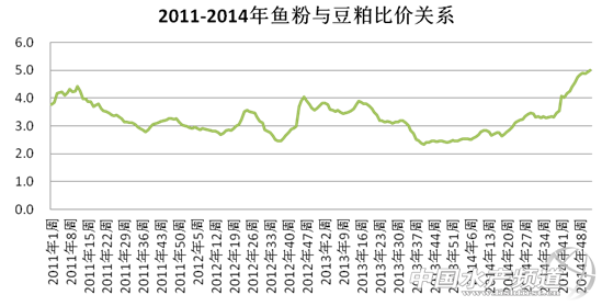 2014年國(guó)內(nèi)魚粉與豆粕平均比價(jià)為3.3,高出傳統(tǒng)2.4的比價(jià)關(guān)系。且近年來(lái),魚粉與豆粕比價(jià)始終處于較高水平,2011、2012和2013年兩者的年平均比價(jià)關(guān)系分別為3.5、3.1和3.1.