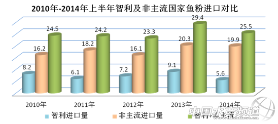 2014年1-11月我國(guó)累計(jì)魚粉進(jìn)口量為98萬(wàn)噸,其中秘魯魚粉進(jìn)口量為49萬(wàn)噸,占進(jìn)口總量的50%,比重較去年同期上漲2%;智利魚粉進(jìn)口量為8.9萬(wàn)噸,占進(jìn)口總量的9%,比重較去年同期下降3%;主流國(guó)家魚粉(秘魯、智利)進(jìn)口量占魚粉進(jìn)口總量的59%,比重較去年同期下降1%;非主流國(guó)家魚粉進(jìn)口量合計(jì)為40萬(wàn)噸,占進(jìn)口總量的41%,比重較去年同期上漲1%。