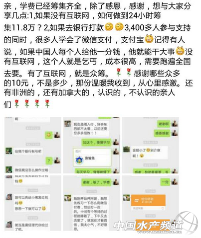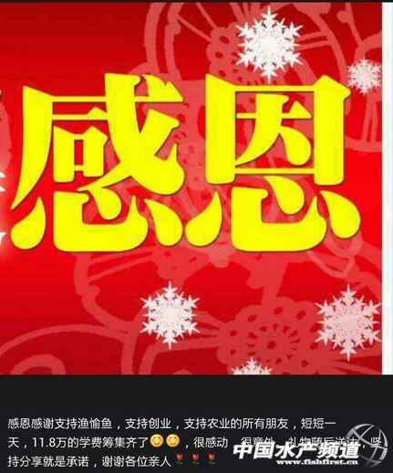 李悅悅 如果你知道漁愉魚,如果你玩朋友圈,如果你加了漁愉魚的任意一位小伙伴,那你一定對“李悅悅”這個名字不陌生~ 李悅悅,漁愉魚水產服務有限公司總經理,水產行業少有的女性水產人之一,愛“折騰”的李悅悅喜歡帶著漁愉魚一起折騰~比如不定期漁愉魚精英特訓營、春節廟會系列活動、一站到底漁醫問答活動,而要數最近的,就是她昨天微信朋友圈中的“折騰”,以當下“流行”的眾籌方式duang的一下為其進入中歐商學院創業營第四期學習籌得學費11.8萬元! 先來看看成果~ 圖為李悅悅朋友圈截圖 一天就是11.8萬啊~ 以下是她在漁愉魚微信公眾平臺上“眾籌”宣言~ 24小時,11.8萬,對此,李悅悅的“獲獎感言”是: 眾籌匯款截圖: (圖片由支持者沈廣龍提供) 還有很多匯款的截圖,小編就不拿出來了(讓我去哭一會兒……小編也要去眾籌男噴油!) 當然,眾籌也不是誰都可以玩兒~(比如像小編這樣的,吼吼~) |