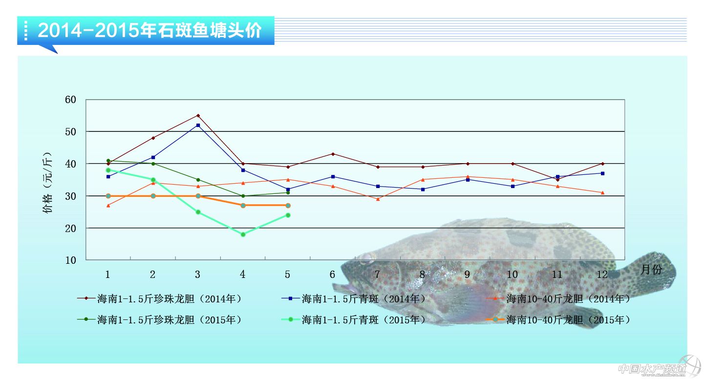 中國水產(chǎn)頻道報(bào)道,5月石斑魚價(jià)格小幅波動(dòng),珍珠龍膽26-30元/斤(1.0-1.6斤),截止到5月20日已恢復(fù)到30元/斤,福建地區(qū)35元/斤。青斑價(jià)格持續(xù)低迷,23-25元/斤(1.0-1.6斤)。珍珠苗0.8-1.0元/公分。5月份石斑魚存塘量依然較大,但市場需求開始上漲,拉動(dòng)石斑魚價(jià)格緩慢上漲。預(yù)計(jì)6月份隨著供求關(guān)系的進(jìn)一步轉(zhuǎn)變,石斑魚價(jià)格將平穩(wěn)上漲。同時(shí),禁漁期開始對(duì)養(yǎng)殖水產(chǎn)品也算利好。但青斑價(jià)格走勢(shì)并不明朗,雖然海南地區(qū)青斑養(yǎng)殖量大減,但福建地區(qū)2014年青斑投苗量倍增。(青島七好生物科技有限公司南方大區(qū)總經(jīng)理 肖林棟博士)