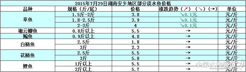 中國水產頻道原創報道,據網友提供消息,下圖就是2015年7月29日湖南安鄉地區部分淡水魚的塘頭價: