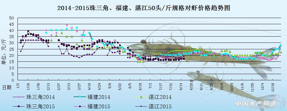 文/中國水產頻道 張靜 中國水產頻道原創報道,下圖是2014年和2015年珠三角地區、湛江地區和福建地區50頭/斤規格對蝦的價格趨勢圖。2015年年初,元旦剛過,各地存塘的蝦非常少,各地蝦價都在飆漲。由圖中可以明顯看出,至3月初為止,2015年的蝦價跟2014年同期的蝦價相比,價格相差10元左右/斤,價格差異幅度較大。 6月下旬,端午節假期一過,各地對蝦的市場消費量劇減,整體銷量馬上呈現回落狀態,受此影響,蝦價也跟著不斷下跌,預計短期內各地的蝦價上漲難度大,后市行情不被看好。 7月初,各地一造蝦的存塘量都減少了很多,相應的整體對蝦供應量也減少了,雖然市場的銷量沒有增大,但是蝦價方面也有回暖的跡象,如果短期內對蝦供應量保持穩定的話,后市蝦價上漲空間會更大。 7月中下旬,各地降雨天氣頻繁,加之無節假日活動去推動對蝦的市場消費量,整體市場銷量疲軟,對蝦存塘供應量雖然減少,但是蝦價上漲依舊受到阻礙,預計后市蝦價或將持續現狀,價格上漲空間小。 8月初,因為養殖周期還有高溫天氣及病害方面的影響,各地可以供應上市的對蝦量明顯減少,近期對蝦市場的銷售走量都沒有太大變化,整體蝦價都維持在相對穩定的狀態,短期內蝦價不會有明顯的升降變化。 8月中旬,各地對蝦供應依舊處于青黃不接的狀態,蝦中的實際收購量受此影響也出現時少時多的現象,整體市場走量少,加上對蝦市場的剛性需求不大,致使部分地區的蝦價出現波動。具體價格趨勢如下: 據悉,最近幾天對蝦市場的銷量較差,整體市場走量少,加上各地存塘的對蝦供應處于青黃不接的狀態,蝦中的實際對蝦收購量受此影響也出現時少時多的現象,部分地區的蝦價也出現了波動,但整體蝦價升降幅度不大。具體價格如下: 珠三角地區和湛江地區最近的對蝦出塘量都很少,一部分原因是存塘合規格上市的對蝦量少,整體供應短缺,另外一部分的原因是養殖戶想多投喂一些飼料,再養殖多一段時間、把對蝦的產量提高之后再出售。受到供應量的影響,現在很多蝦中的實際對蝦收購量都大大減少,而且收購量經常有時少時多的情況出現,加上近期沒有節假日活動去推動市場的消費量,整體的市場銷量較差,蝦中的收購意愿也不強,部分蝦中已經處于半休市狀態。 江蘇如東地區養殖的對蝦目前還沒有達到上市的規格,普遍規格在100頭/斤左右,養殖情況良好的話,預計可以在中秋節前后上市。現在除了個別發病的小規格對蝦被養殖戶出售,其它的對蝦則基本無銷售,而且病蝦的賣價很低,只有幾元一斤。如東地區的高溫天氣剛過去沒幾天,最近的天氣都很晴朗,白天的最高溫度有30°C左右,整體氣溫還是比較舒適,據天氣預報說未來如東地區可能會有一周的時間是處于連續陰雨。(以上價格及觀點僅供參考) 【關鍵字】: 對蝦 對蝦價格 對蝦養殖 中國水產頻道原創報道,轉載請說明出處 中國水產頻道 m.fuqitext.com ,違者追究法律責任, 謝謝合作。 |
