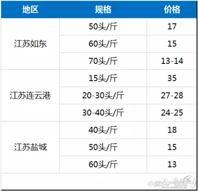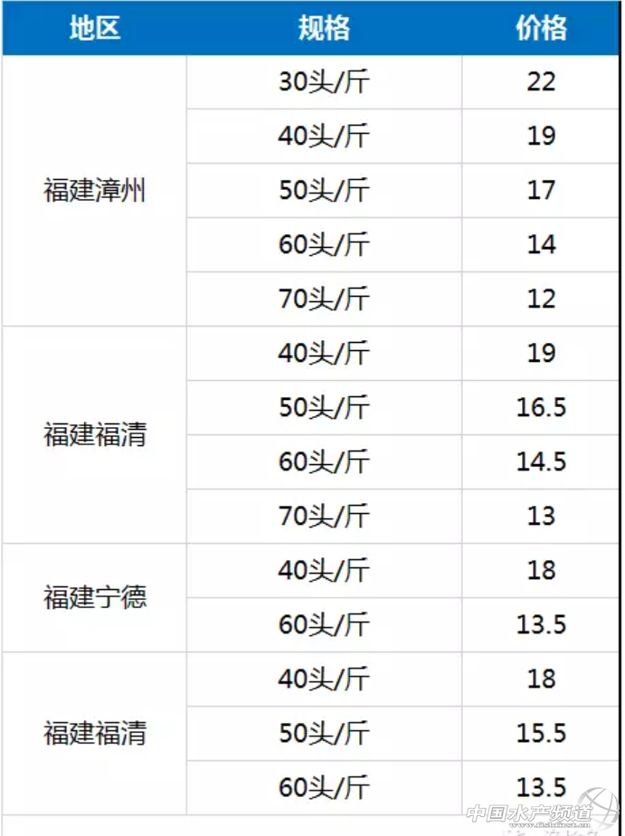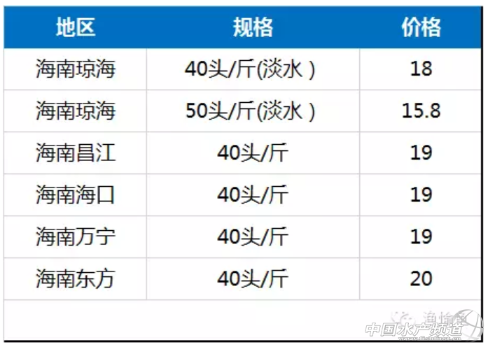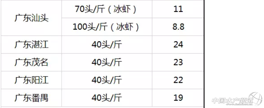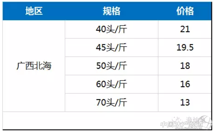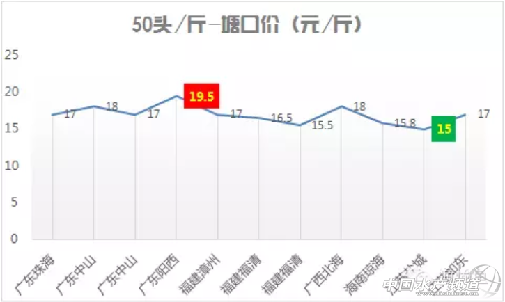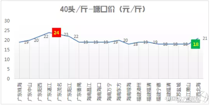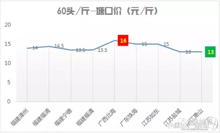 主要出塘地區:廣東、福建,海南,江蘇地區 主要出塘規格:40頭/斤、50頭/斤、60頭/斤 一、具體規格最高最低分析 40頭/斤 主要出塘地區廣東、海南、福建 最高出塘價廣東茂名24元/斤 最低出塘價江浙一代18元/斤 50頭/斤 主要出塘地區廣東、福建 最高出塘價廣東陽江19.5元/斤 最低出塘價江蘇鹽城15元/斤 60頭/斤 主要出塘地區福建 最高出塘價廣西北海16元/斤 最低出塘價浙江蕭山13元/斤 二、按照地區各種規格出塘價 廣東地區 廣西地區 海南地區 福建地區 江蘇地區 其他地區 |