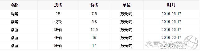 摘要: 2016年6月17日廣東順德地區2P級烤鰻7.5萬元/噸,統級5.8萬元/噸,3P新12.5萬元/噸,4P新15萬元/噸,5P新17萬元/噸,