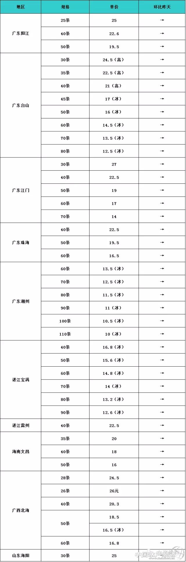 中國水產頻道報道, 南美白對蝦 羅非魚 其他水產品 行情分析 暑期小旺季來臨,白蝦需求量增大,低迷的白蝦市場有了復蘇的跡象。在中堅消費市場的拉動下,白蝦價格行情穩中有漲,預計高位池蝦在未來一周時間左右會有0.5-1元升幅;因土塘蝦因存量較大,價格變化不大。 羅非魚方面,價格已經跌到見底,估計也不會再有跌幅。近期,加工廠雖然有作調整,但也不值得樂觀,預測未來一周內,羅非魚行情變化不大。 連日來,土塘金鯧魚價一路下跌,在未來的一段時間,低迷的行情依然難有起色。與此同時,網箱養殖0.7斤以上/尾的金鯧魚目前價格行情雖然能維持在相對較高水平(15元/斤),但到了本月底,早批新魚上市,屆時行情也不容樂觀,預測會有0.5-3元/斤的跌幅。朋友們,要密切關注啊! 以上僅供參考! |