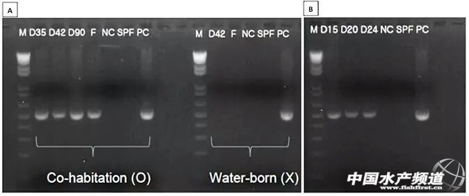 中國水產(chǎn)頻道報道,不同種類的微孢子蟲會對對蝦的肌肉組織,心臟,性腺,鰓,肝胰臟,和神經(jīng)節(jié)產(chǎn)生感染。對蝦微孢子蟲被視為對蝦群體一個潛在威脅,并且會對水產(chǎn)養(yǎng)殖業(yè)的經(jīng)濟效益造成影響。近期,一種叫對蝦腸胞蟲病(EHP)的微孢子被發(fā)現(xiàn)存在于對蝦的肝胰腺中的小管上皮細(xì)胞的細(xì)胞質(zhì)中。在一些東南亞國家,例如越南,泰國,馬來西亞,印度尼西亞,中國和印度的對蝦養(yǎng)殖場已經(jīng)相繼發(fā)現(xiàn)此類微孢子的存在。對蝦腸胞蟲病(EHP)的臨床癥狀還未具體化,但已發(fā)現(xiàn)與對蝦發(fā)育遲緩有關(guān)聯(lián)。 對蝦腸孢蟲病(EHP)的組織病理學(xué) 在檢查被對蝦腸孢蟲。‥HP)感染的來自越南的南美白對蝦(2014)樣本中發(fā)現(xiàn)肝胰腺小管上皮細(xì)胞的細(xì)胞質(zhì)中存在嗜堿細(xì)胞內(nèi)含物(圖1A&1B)。在這實驗中,孢蟲呈現(xiàn)出原形體階段,成熟嗜堿性的孢子也被檢測到。被對蝦腸孢蟲病(EHP)感染的來自文萊的藍對蝦(2006)也發(fā)現(xiàn)微孢子蟲存在于肝胰腺(圖1C)。這些結(jié)果顯示對蝦腸孢蟲病(EHP)早在2006年就存在在亞洲。 對蝦腸孢蟲病的聚合酶鏈反應(yīng) 圖1:對蝦腸孢蟲病(EHP)組織病理學(xué)顯現(xiàn)在感染的對蝦上。(A&B)南美白對蝦的肝臟胰組織,(C)藍對蝦。箭頭代表成熟的孢子;星星代表原形體階段。(比例=25μm.) 我們選擇用來檢測對蝦腸孢蟲。‥HP)的染色體底物包括EHP-510F(5’-GCCTGAGAGATGGCTCCCACG)和EHP-510R(5’-GCGTACTATCCCCAGAGCCCG)。用已經(jīng)受感染的對蝦DNA提取物實施聚合酶鏈反應(yīng)(PCR)。結(jié)果顯示這個聚合酶鏈反應(yīng)能夠檢測出已受感染的對蝦(圖2,1-3行);染病對蝦的排泄物以及水質(zhì)樣本均被檢測出感染對蝦腸孢蟲(EHP)(圖2,4-5行)。同時我們也檢測了另外兩種寄生蟲病原體:阿米巴蟲和蝦白肉病微孢子蟲,然而這些對蝦腸孢蟲。‥HP)底物并沒有與該兩種病蟲發(fā)生交叉反應(yīng)(圖2,6-7行)。 圖4.用地高辛標(biāo)記法標(biāo)記的對蝦腸孢蟲病(EHP)探針在對連續(xù)部位進行原位雜交。深藍色沉淀物表示對蝦腸孢蟲病(EHP)的出現(xiàn)(A)用對蝦腸孢蟲病(EHP)探針對南美白對蝦(越南)進行原位雜交;(B)藍對蝦(文萊);(C)斑節(jié)對蝦表現(xiàn)出了白肉病癥狀(馬達加斯加),插入圖片(D):使用Pereziapenaei探針的原位雜交。比例條=25μm。 令人意外的是,我們從4/9的冷凍鹵蟲生物樣本中檢測出對蝦腸孢蟲病(EHP)(圖2,9行,一個非常具有代表性的樣本)。在這些對對蝦腸孢蟲病(EHP)呈陽性的樣本中,18SrRNA基因被擴充和重新排列。這個被修改的序列與來自越南的對蝦腸孢蟲病樣本有99.9%的相似,也就是說鹵蟲中所帶有的對蝦腸孢蟲病(EHP)很可能源自東南亞。 對蝦腸孢蟲病傳播的研究 以上三個生物測定均使用來自泰國的已感染對蝦腸孢蟲病的對蝦樣本。在第一個生物測定(共棲組)中,染病對蝦被轉(zhuǎn)移到實驗缸中與用高彈體標(biāo)記的無特定病原體的對蝦一起生活。35天后,無特定病原體的對蝦感染對蝦腸孢蟲病原(圖3A)。在第二個生物測定(水生感染組)中,用曾飼養(yǎng)過染病對蝦的水體轉(zhuǎn)移到無特定病原體的對蝦實驗缸中。42天以后,無特定病原體的對蝦依舊沒有感染病原(圖3A)。在第三個生物測定中,用染病對蝦的肝胰腺喂養(yǎng)無特定病原體的對蝦,每隔五天用聚合酶鏈反應(yīng)(PCR)分析樣本;15天后,無特定病原體的對蝦感染病原(圖3B)。實驗結(jié)果顯示,對蝦腸孢蟲病(EHP)可以通過嗜食同類傳播。 原位雜交(ISH) 通過用地高辛標(biāo)記法標(biāo)記的對蝦腸孢蟲病進行原位雜交,染病的南美白對蝦(圖4A)和藍對蝦(圖4B)顯示微孢子(嗜堿性的內(nèi)含物)存在于肝胰腺小管的上皮細(xì)胞中。實驗中的探針具有非常高的識別敏銳性,在已感染蝦白肉病的斑節(jié)對蝦中,該探針無任何反應(yīng)顯示(圖4C)。 結(jié)語 圖2.對蝦腸孢蟲病聚合酶鏈反應(yīng)(PCR)檢測對蝦腸孢蟲。‥HP)。M:1kb以上的階梯型分子量標(biāo)準(zhǔn)。從越南收集來的南美白對蝦樣本(第一行,2014年樣本;第二行,2015年樣本)和來自泰國(3-5行,無特定病原體對蝦,排泄物和水),感染白肉病的斑節(jié)對蝦(第六行),感染阿米巴蟲的南美白對蝦(第七行),無特定病原體的南美白對蝦(第八行),鹵蟲生物樣本(第九行),無操作對照組(第十行)。 對蝦腸孢蟲病(EHP)在養(yǎng)殖對蝦中的傳播可能還會繼續(xù),需要通過建立有效的方法來監(jiān)控這種寄生蟲的發(fā)病和傳播。所以通過用敏銳的分子生物學(xué)方法去檢測對蝦,活餌料和蝦塘環(huán)境的對蝦腸孢蟲病(EHP)會非常有效。感染對蝦腸孢蟲病(EHP)的對蝦通常不能被肉眼識別,因為EHP不會呈現(xiàn)臨床癥狀。本研究表明基于聚合酶鏈反應(yīng)(PCR)和原位雜交(ISH)的檢測方法和診斷步驟具有具體性和靈敏性,可作為有效的常規(guī)診斷方法去檢測對蝦養(yǎng)殖群體,池塘環(huán)境和對蝦產(chǎn)品。 圖3:聚合酶鏈反應(yīng)生物檢測1,生物檢測2,以及shengwujiance3的肝胰腺樣本。(A)35天后檢測出共棲組存在EHP,但是不能檢測到水生感染組。(B)15天后,EHP在(嗜食同類)被檢測到。 相關(guān)鏈接: 世界頂級專家解讀對蝦肝腸胞蟲。‥HP) 2015年10月,在加拿大舉辦的全球水產(chǎn)養(yǎng)殖聯(lián)盟對蝦專題會議上,EHP成為熱點話題,對蝦專家組的成員