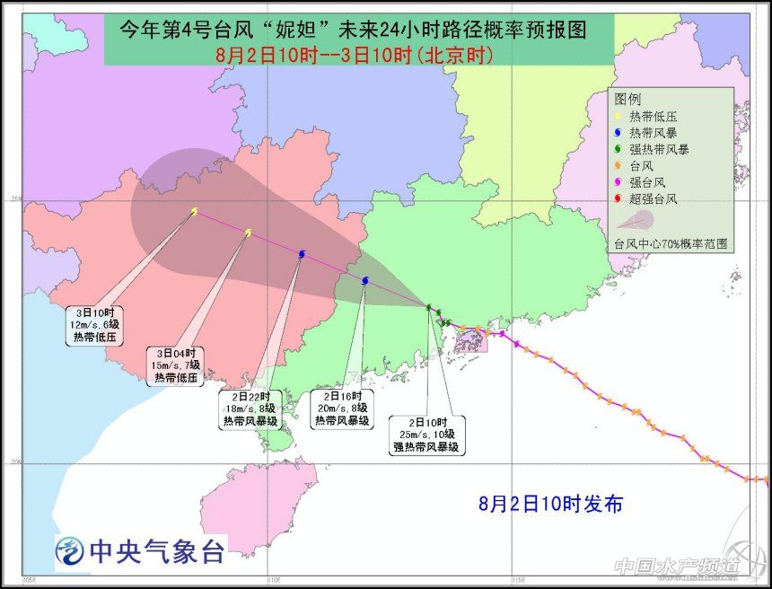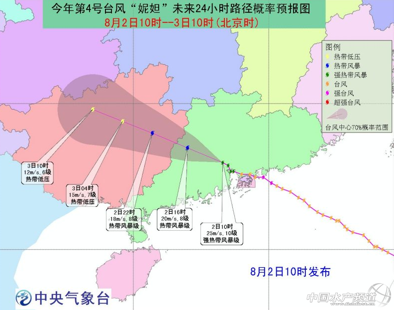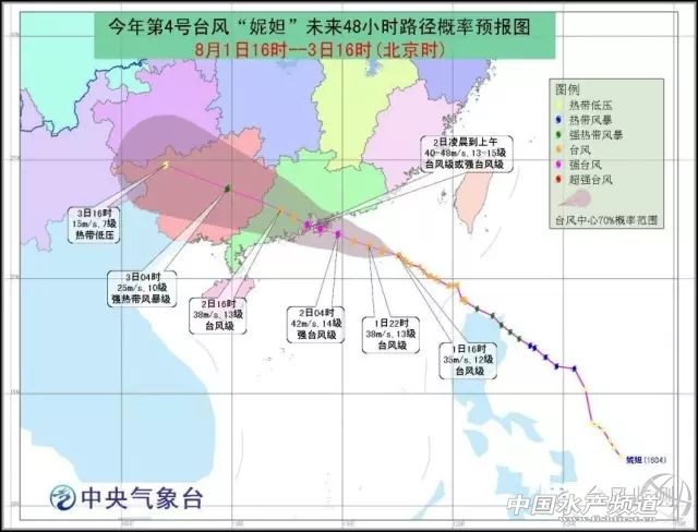 今年第四號臺風“妮妲”自7月底生成以來就一直牽動著所有華南水產人的心!中央氣象臺預計“妮妲”于8月2日凌晨至上午登陸珠三角,登陸時或達15級強臺風級,是33年來正面襲擊珠江口最大的臺風。8月1日中央氣象臺發布臺風紅色預警!國家海洋預報臺發布風暴潮I級紅色警報。8月2日凌晨3點35分在廣東省深圳市大鵬半島登陸,最大風力達14級。中國水產頻道發起了:直擊強臺風“妮妲”!正面襲擊珠三角(實時更新)的專題報道。敬請大家關注! 中國水產頻道綜合整理報道: 8月5日9:32實時更新:中央氣象臺停止關注“妮妲”,本專題到此結束 中央氣象臺停止關止,本專題到此結束。感謝大家的關注和支持! 8月4日14:32實時更新:慘烈!“妮妲”擄走惠東大亞灣網箱300-400萬元的鮸魚、金鯧魚 8月2日凌晨3:35分,今年第四號臺風“妮妲”在深圳市大鵬半島登陸,登陸時中心附近風力達到了14級,成為近年來正面登陸珠三角的最強臺風。果然不出所料,從來是靠天吃飯的水產養殖行業,仍然沒能僥幸逃過“妮妲”的肆虐。作為“間接兇手”,“妮妲”不導致了廣東惠東大亞灣網箱養殖的鮸魚、金鯧魚損失達300-400元。據了解,鮸魚已經養殖了一年多時間,金鯧魚一般達4-6兩規格,并且拖回最早、靠內港越深的魚排死魚最嚴重,損失較大可能有4-5戶養殖戶,平均損失達40萬元/戶,而損失8-10萬的也有10多戶人,預計初步損失在300-400萬元。相反離內港越遠,擠不進內港的魚排反而損失很小或基本無損失。(詳情點擊:http://m.fuqitext.com/article-80556-1.html) 8月4日7:32實時更新:受“妮妲”減弱的殘留低壓影響,云貴等地仍有較強降雨 受“妮妲”減弱的殘留低壓影響,昨天云南南部、貴州中東部和南部、廣西中西部和東南部等地部分地區出現暴雨,貴州東南部和廣西中部局地出現大暴雨(100~140毫米)。另外,四川盆地西南部、江漢、黃淮中部、江淮中東部和江南東北部等地部分地區出現暴雨,湖北中部、安徽北部、浙江西部等局地出現大暴雨(100~188毫米)。 臺風“妮妲”及殘留低壓過程降雨量:1日14時至4日07時,廣東中西部和東部沿海、廣西中東部、貴州東南部和福建東南部等地的部分地區累計降雨量有100~230毫米,廣東珠三角地區和上川島局地達250~319毫米。 未來三天,受“妮妲”減弱的殘余低壓影響,云南、貴州等地仍有較強降雨,需繼續防范較強降雨及其引發的次生災害。 8月3日18:00實時更新:“妮妲”將繼續影響廣西云貴 受“妮妲”減弱后的殘余低壓環流的影響,8月3日20時至4日20時,廣西西北部、貴州大部、云南東部和南部、四川盆地西南部等地有大雨或暴雨,其中,貴州東南部、云南東南部和四川盆地西南部的部分地區有大暴雨(100~120毫米);上述地區局地并伴有短時強降水、雷暴大風等強對流天氣,最大小時雨強40~60毫米。中央氣象臺于3日18時繼續發布暴雨藍色預警。 8月3日7:30實時更新:“妮妲”已減弱為7級熱帶低壓,現位于廣西河池境內 最新監測顯示:8月3日5時,今年第四號臺風“妮妲”已減弱為熱帶低壓,位于廣西河池市羅城縣境內,北緯24.8度、東經108.9度,中心附近最大風力7級(15米/秒,),中心最低氣壓995百帕。“妮妲”將以每小時20公里的速度向西偏北方向移動,強度逐漸減弱。8月3日5時06時解除臺風藍色預警。8月3日08時至4日08時,南海西北部、北部灣以及廣東西部沿海、廣西沿海仍將有5-6級風,部分海域或地區陣風可達7-8級;廣西大部、貴州大部、云南東南部等地將有大雨或暴雨,其中,貴州東南部的部分地區有大暴雨(100~170毫米)。 受臺風“妮妲”影響,1日14時至3日06時,廣東中西部和東部沿海、福建東南部、廣西東部和南部等地的部分地區累計降雨量有100~200毫米,廣東珠三角附近和上川島局地有210~304毫米。廣西梧州震區2日午后開始降雨,累計雨量80~100毫米。 8月2日15:30實時更新:“妮妲”減弱為熱帶風暴,中心風力8級,位于廣東省廣寧縣境內 最新監測顯示:8月2日15時,今年第四號臺風“妮妲”已減弱為熱帶風暴,位于廣東省懷集縣境內,也就北緯23.6度、東經112.2度,中心附近最大風力8級(20米/秒),中心最低氣壓995百帕。“妮妲”將以每小時20公里的速度向西偏北方向移動,強度逐漸減弱。 8月2日11:42實時更新:目前反饋:臺風對水產養殖影響不大(附臺山、陽江、廉江報料信息) 臺山: 臺山養殖戶報料:臺風對臺山北陡影響不大,早上才有雨 陽江: 陽洋閘坡大洋碼頭的金鯧魚養殖魚排 陽江養殖戶和飼料廠家業務經理報料:廣東陽江目前刮5-6級風,也不大,下了幾滴毛毛雨,預計對水產養殖基本沒影響。 廉江: 廣東廉江市營仔鎮老閘圍的養殖戶報料表示,臺風不到,目前養殖塘風平浪靜,與往常沒什么兩樣。(來自:中國水產頻道) 8月2日10:26實時更新:“妮妲”今晨7點鐘減弱為強熱帶風暴,10點鐘時位于廣東廣州市海珠區境內 中央氣象臺8月2日10時發布臺風黃色預警: 今年第4號臺風“妮妲”已于今天早晨7點鐘減弱為強熱帶風暴,上午10點鐘其中心位于廣東省廣州市海珠區境內,就是北緯23.0度,東經113.3度,最大風力有10級(25米/秒),中心最低氣壓988百帕。 預計,“妮妲”將以每小時20-25公里的速度向西偏北方向移動,強度繼續減弱,即將減弱為熱帶風暴級,并將于2日傍晚前后進入廣西境內,隨后于2日夜間在廣西境內減弱為熱帶低壓。 大風預報:8月2日14時至3日14時,南海北部、廣東沿海及珠三角地區、北部灣部分海