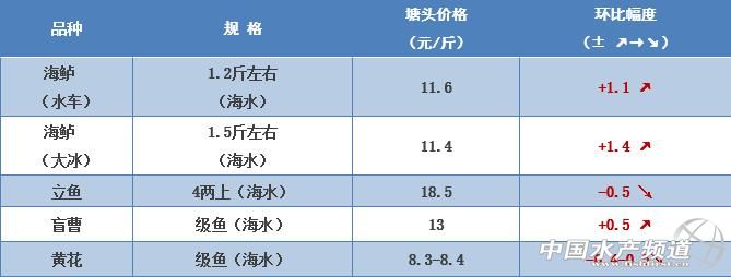◦本文為水產前沿和珠海海龍聯合報價欄目 養好魚,更要賣好魚 珠三角地區最新魚價行情一手掌握 草魚:2-5兩和3-7兩草魚種一苗難求;大草魚價格上漲 1-3兩的草魚種目前市場上開始大批量供應,目前價格會相對穩定,后期價格應該會滑落。2-5兩和3-7兩的市場存塘量少,一苗難求,價格會持續走穩,但上漲空間不大。另外目前存塘的統鯇偏少,進塘的規格魚種也少,導致統鯇的價格還會持續緩慢攀升。大草魚受限于市場存塘量少,價格依然會往上走;脆肉鯇在新脆出來之前價格依然會略有上漲,總體行情利好。 黃顙魚:存塘量、運輸量、出魚量均減少 黃顙魚存塘量少,高溫期由于運輸量少,客戶出魚量也減少,價格相對穩定。 無鱗魚類 海水魚:鱸魚價格全面上升 鱸魚水車和鱸魚大冰價格全面上升,后市繼續看好。盲曹價格較好,黃花,立魚價格下行。 其他魚類 最新價格行情如下表格 淡水特種魚 其他魚類 |