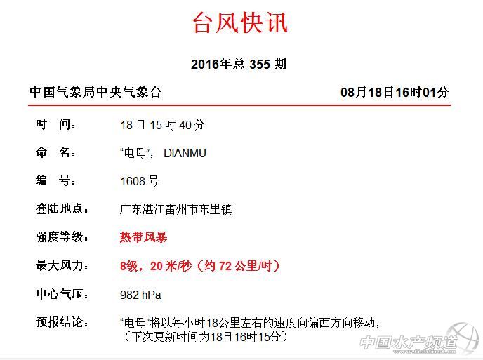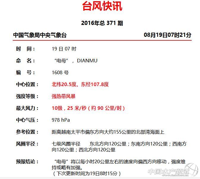海南、雷州半島、廣西沿海(北部灣)一直是中國水產養殖重中之重地區,之前1-7號臺風,大家慶幸沒有對三地造成太大影響。但現在一個在昨天急切生成的臺風就要到訪!大家必須要提高十二萬分警惕,齊心協心地對抗即將到來的第8號臺風“電母”。據中央氣象臺報道:它將于18日傍晚登陸雷州半島,強度8~9級,18日晚上移入北部灣,強度10~11級。而目前,海南島已經變“水城”...中國水產頻道發起了:直擊第8號臺風“電母”(實時更新專題):今天將登陸水產養殖重地雷州半島。水產人挺住!一起抗擊“電母”!