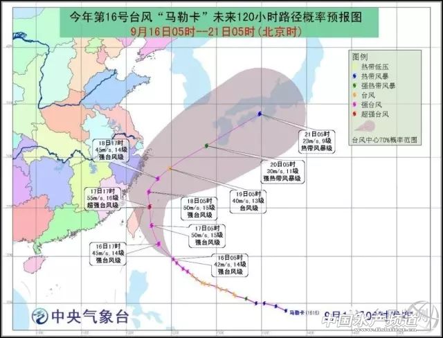 中央氣象臺9月16日05時發布的“馬勒卡”未來5天路徑概率預報 對于“馬勒卡”后期的強度,國內外預報機構均認為它可能達到超強臺風級。雖然它的巔峰強度可能遠不及“莫蘭蒂”的70米/秒那么恐怖,但是“馬勒卡”的個頭卻比“莫蘭蒂”大了一號,并且西南季風與“馬勒卡”保持良好的“聯系”,源源不斷地向它輸送充足的水汽。