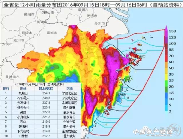 浙江省自動站12小時雨量分布圖及全省自動站降水量排名前十的站點及降水量數據(9月15日18時到9月16日06時) 最新的自動站監測數據顯示,過去12小時(9月15日18時到9月16日06時),浙江東部沿海和北部普遍出現了50毫米的強降水,寧波、臺州、麗水、溫州部分地區出現了150毫米以上的特大暴雨。全省自動站降水排名前十的站點降雨量普遍在200毫米以上,測得的最大降雨量出現在寧波北侖區的九峰山,12小時降雨量達到了254.1毫米,用傾盆大雨來形容好不夸張!