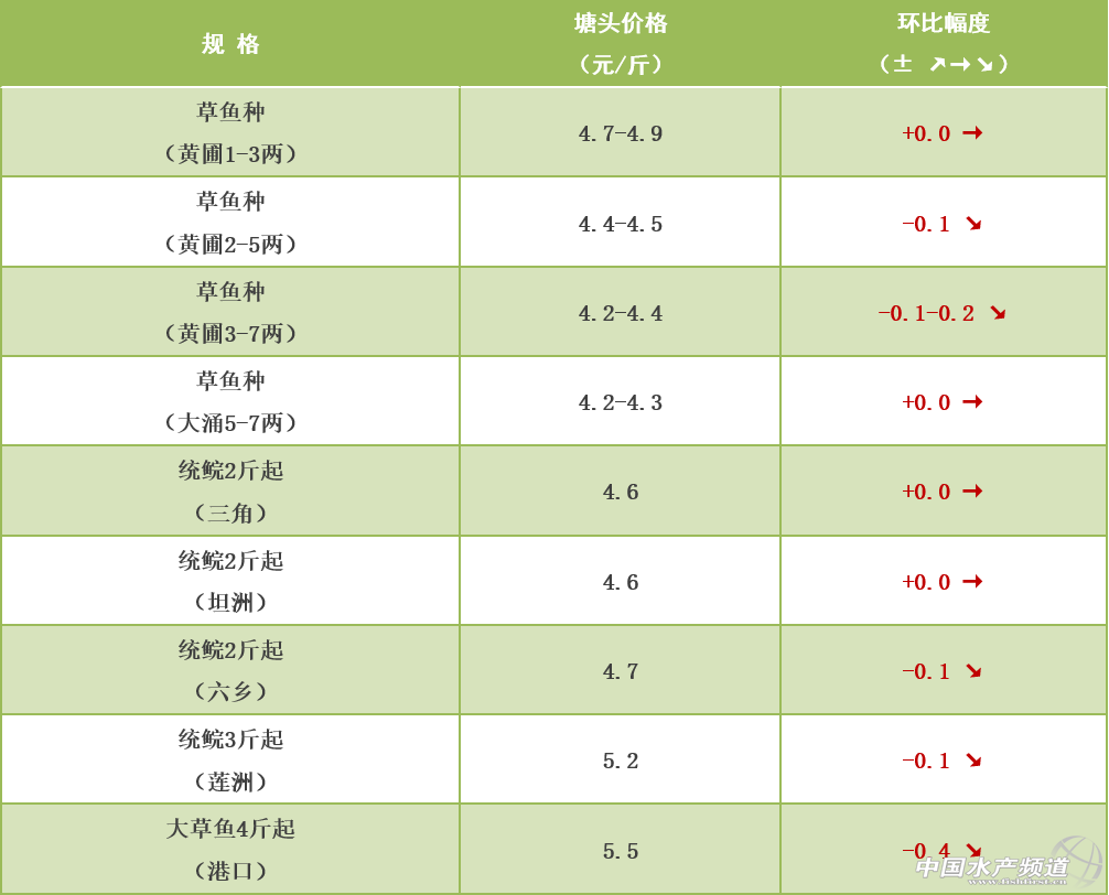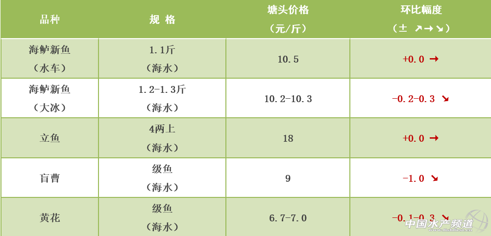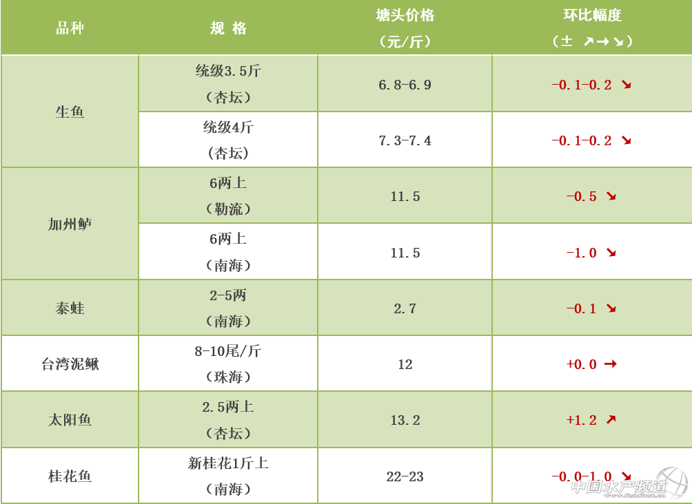 中國水產頻道報道,本文為水產前沿和珠海海龍聯合報價欄目 養好魚,更要賣好魚 珠三角地區最新魚價行情一手掌握 草魚 魚種、超市魚和大草魚,價格仍下降 1-3兩、2-5兩和3-7兩草魚種價格持續下行,存塘壓力大,流通慢。超市魚價格將會繼續下降,流通緩慢,受此影響,大草魚價格跟著下跌。脆肉鯇在流通和價格上都持續平穩。 草魚 黃顙魚 出魚數量逐漸增多,后市看好 黃顙魚舊魚存塘量少,受供求關系影響,加上近期轉季天氣逐漸轉涼,出魚數量逐漸增多,價格維持相對穩定,后市看好! 無鱗魚類 海水魚 新魚魚價較好 新魚魚價行情繼續保持較好。盲曹,黃花價格跌幅較大,立魚價格穩定。 海水特種魚 其他魚類 最新價格行情如下表格 淡水特種魚 普通魚類 上述報價可能會因區域、規格、品質和時間等因素的不同而會產生差異,在此僅供參考。 |