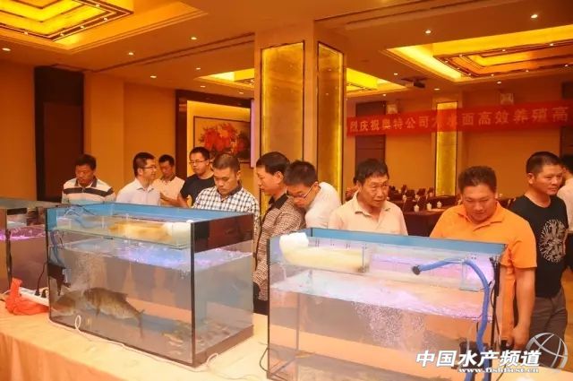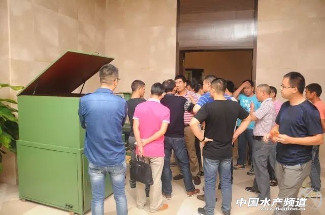 參會人員在觀看海大百容的大頭苗種、鯽魚苗種、全雄黃顙魚苗種