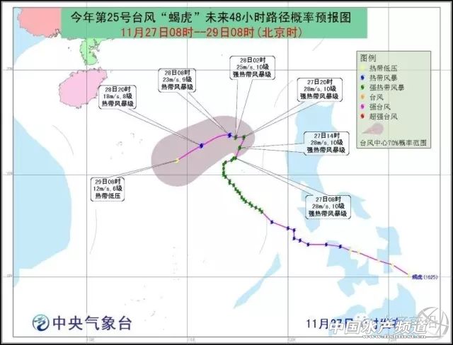 今年第25號臺風“蝎虎”(強熱帶風暴級)的中心今天(27日)上午10點鐘位于黃巖島北偏西方大約85公里的南海中部海面上,就是北緯15.8度、東經117.5度,中心附近最大風力有10級(28米/秒),中心最低氣壓982百帕,七級風圈半徑為100~130公里,十級風圈半徑為40公里。 預計,“蝎虎”將以每小時5~10公里的速度向北偏東方向移動,28日以后將轉向西南方向移動,強度先維持,爾后逐漸減弱,并將在南海中部海域減弱消失。 大風預報:受“蝎虎”和冷空氣的共同影響,27日14時至28日14時,浙江沿海、福建沿海、廣東沿海、海南沿海、臺灣沿海、廣西沿海、東海大部、臺灣海峽、臺灣以東洋面、巴士海峽、北部灣以及南海北部、中部和西南部將有7~8級、陣風9~10級的大風,其中黃巖島附近及以北部分海域的風力有9~10級,陣風可達11級。