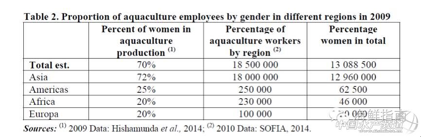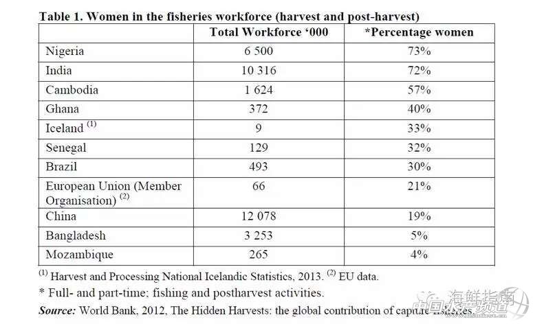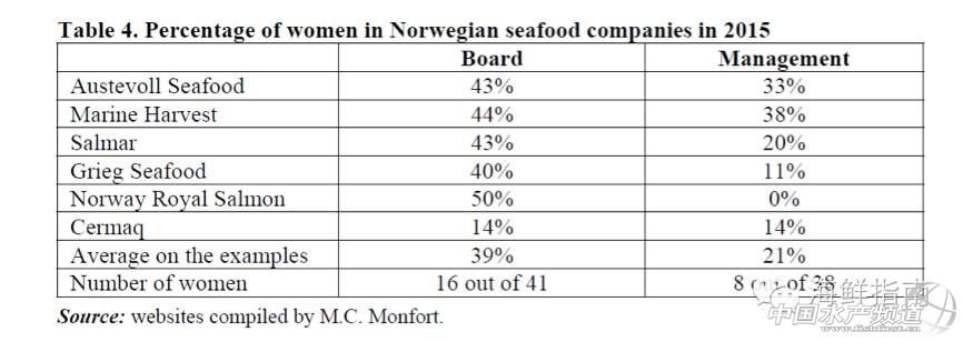 中國(guó)水產(chǎn)頻道報(bào)道,從南到北,從沿海到內(nèi)陸,從發(fā)達(dá)國(guó)家到發(fā)展中國(guó)家,如今的捕撈漁業(yè)和水產(chǎn)養(yǎng)殖為人類貢獻(xiàn)了四分之一的優(yōu)質(zhì)動(dòng)物蛋白。而在這個(gè)宏偉事業(yè)的背后,您可曾有人曉得無(wú)數(shù)女性工作者為此默默奉獻(xiàn)青春和汗水? 據(jù)世界銀行2012年的統(tǒng)計(jì)資料,若將全球水產(chǎn)業(yè)全產(chǎn)業(yè)鏈與相關(guān)服務(wù)業(yè)考慮在內(nèi),女性從業(yè)人員已超過(guò)半數(shù),女性工作者對(duì)水產(chǎn)業(yè)的影響力越來(lái)越顯著。水產(chǎn)業(yè)因此成為唯一一個(gè)女性人數(shù)占優(yōu)的農(nóng)牧行業(yè)。 由于水產(chǎn)業(yè)的分工已高度細(xì)化,各國(guó)各地區(qū)的地緣條件迥異,女性工作者對(duì)水產(chǎn)業(yè)的參與環(huán)節(jié)與從業(yè)比率各有不同。 女性從業(yè)人員已撐起水產(chǎn)業(yè)的半邊天 聯(lián)合國(guó)糧農(nóng)組織統(tǒng)計(jì),全球約1.2億人口依賴漁業(yè)謀生,540萬(wàn)左右的女性工作者直接從事海洋捕撈業(yè)。這個(gè)比例其實(shí)是相當(dāng)?shù)偷模治稣J(rèn)為這個(gè)現(xiàn)象反映出許多發(fā)展中國(guó)家的文化規(guī)則和社會(huì)習(xí)俗限制了女性進(jìn)入生產(chǎn)環(huán)節(jié)。比如,在非洲,因遠(yuǎn)海捕撈漁業(yè)極具危險(xiǎn)性,以家庭為單位的漁民出海時(shí)一般不帶女眷,待到漁民收獲歸回后,他們的妻女負(fù)責(zé)將漁獲重新分類,分批賣向市場(chǎng)。 表1:一些國(guó)家的漁業(yè)工人總數(shù)與女工占比 在東南亞,女性也很少直接參與遠(yuǎn)海捕撈,同樣以家庭為單位的作業(yè)模式,婦女參與的生產(chǎn)活動(dòng)主要在近岸,通過(guò)手工拾取近海岸的貝類,并做一些初步的分類工作。在家庭管理、海產(chǎn)品交易和后勤保障上,婦女扮演重要角色。 在水產(chǎn)養(yǎng)殖業(yè)里,女性的參與程度卻要高出很多。中國(guó)和東南亞水產(chǎn)養(yǎng)殖業(yè)均以小規(guī)模家庭為單位,隨著中國(guó)農(nóng)村人口進(jìn)城務(wù)工的數(shù)量攀升,農(nóng)村女性勞動(dòng)力的比率卻在逐年上升,2012年已達(dá)到33%。在印尼,幾乎所有的淡水養(yǎng)殖場(chǎng)均聘用過(guò)女性勞動(dòng)力,女性工人的占比達(dá)42%。而在水產(chǎn)養(yǎng)殖業(yè)迅速崛起的越南,80%以上的養(yǎng)殖工人是婦女。60%的女性工人支撐起泰國(guó)的南美白對(duì)蝦養(yǎng)殖業(yè),她們以投喂飼料、池塘清理、水質(zhì)檢測(cè)、采購(gòu)魚(蝦)苗、統(tǒng)計(jì)數(shù)據(jù)等為主要工作,10%左右的泰國(guó)養(yǎng)蝦場(chǎng)的所有權(quán)和管理權(quán)掌握在女老板手上。 表2:四大州水產(chǎn)養(yǎng)殖業(yè)工人數(shù)量與女工占比 表3:女性在漁業(yè)與采后操作工作的參與度 北歐大型三文魚養(yǎng)殖場(chǎng)同樣聘用女工,比率為13%;智利養(yǎng)殖場(chǎng)為10%。 當(dāng)然,女性工人已全球所有的水產(chǎn)品加工廠的絕對(duì)主力軍。世界銀行的調(diào)查報(bào)告顯示,85.5%的水產(chǎn)品加工廠工人為女性,水產(chǎn)品包裝與物流環(huán)節(jié)的女工占比更高達(dá)90%。在依賴水產(chǎn)品出口的亞洲國(guó)家,幾乎每一條羅非魚和每一只南美白對(duì)蝦的出口加工均經(jīng)過(guò)了女工的巧手,女性工人成就了亞洲出口額最高的兩種水產(chǎn)品的全球市場(chǎng)地位。 水產(chǎn)業(yè)相關(guān)的服務(wù)行業(yè)更需要女白領(lǐng) 水產(chǎn)業(yè)可持續(xù)發(fā)展依賴非政府組織的協(xié)同支持。據(jù)FAO統(tǒng)計(jì),全球漁業(yè)非政府組織中,約61%員工為女性。其中,MSC(海洋管理委員會(huì))認(rèn)證機(jī)構(gòu)的人力資源部資料顯示,全球142位員工中,80位為女性,而MSC德國(guó)分支機(jī)構(gòu)中的全部員工均為女性。 消費(fèi)市場(chǎng)對(duì)可持續(xù)水產(chǎn)品的需求日益上升,水產(chǎn)業(yè)相關(guān)的服務(wù)業(yè)也將吸引越來(lái)越多參與者,女性白領(lǐng)對(duì)產(chǎn)業(yè)可持續(xù)發(fā)展的貢獻(xiàn)已不可同日而語(yǔ)。 水產(chǎn)業(yè)的“玻璃天花板”有待打破 然而,水產(chǎn)企業(yè)中女性高管的人數(shù)長(zhǎng)期處于低位,企業(yè)職務(wù)的級(jí)別越高,女性領(lǐng)導(dǎo)者越是稀少,甚至顯得有些拿不出臺(tái)面。Undercurrent News百?gòu)?qiáng)水產(chǎn)企業(yè)報(bào)告顯示,世界排名前100水產(chǎn)企業(yè)僅兩位女性CEO。其中一位是現(xiàn)居日本水產(chǎn)企業(yè)Marusen Chiyoda Suisan的一把手位置,另一位則是太平洋恩利國(guó)際控股(非正式稱呼太平洋恩利集團(tuán))的現(xiàn)任CEO:黃培圓(Jessie Ng)。 2015年,太平洋恩利已深陷巨額債務(wù)的泥潭,黃培圓從父兄手上接過(guò)沉重的擔(dān)子,與債權(quán)人展開了巧妙的斡旋,并于2016年6月30日領(lǐng)導(dǎo)公司做出了最重要的決策:申請(qǐng)破產(chǎn)保護(hù)。 表4:挪威六大水產(chǎn)企業(yè)董事會(huì)席位與管理層的女性成員占比 表5:各國(guó)水產(chǎn)業(yè)經(jīng)理級(jí)別的女性高管占比 亞洲水產(chǎn)企業(yè)女性職員難以晉級(jí)升遷至企業(yè)核心管理層,但這個(gè)“玻璃天花板”卻在歐洲漁業(yè)發(fā)達(dá)的國(guó)家被打破。水產(chǎn)品