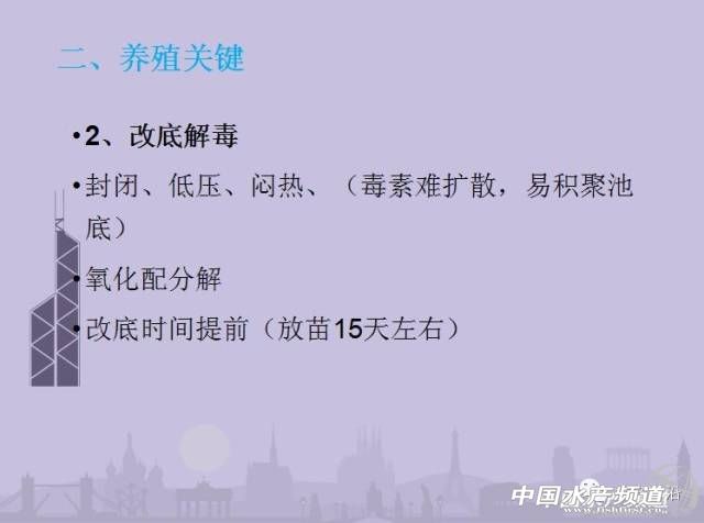 目前清塘所用的藥物推薦使用生石灰,至少經(jīng)10-15天時間同時曬塘,等到堿性沒那么強了,才建議進水。如果堿性還是比較強,建議先進少量的一點水,沖洗池塘后排掉再進水。進完后還要沉淀1-2天再消毒。如果是用漂白粉則可以直接用,因為漂白粉本身就有沉淀效果,然后把塘底的水直接抽掉20-30公分,留下上層水,剩下的池水至少要有80公分。如果繼續(xù)用漂白粉消毒的話,至少要留出7-8天時間。所以整個過程算起來至少要花去15-20天時間。想養(yǎng)好冬棚,塘底如果不處理好的話,后面很難保證養(yǎng)殖成功,冬棚投入的成本比較高,養(yǎng)不好的話就虧大了。所以哪怕白水塘養(yǎng)虧了,少賺點,也要保證冬棚的成功。這點很重要:一定要留出足夠的時間來做好以上的清塘、曬塘、消毒工作。