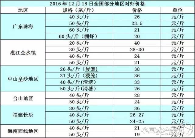 中國水產頻道獨家報道, 珠三角地區近期天氣較為反常,時冷時熱的,很多棚蝦都有應激發病的跡象出現,加上可供上市的對蝦存塘少,下周三又是冬至節,很多蝦中都提前囤貨,因此珠三角近期的蝦價也稍有波動,但多數蝦中收蝦還是直接看對蝦質量給價格的。現在各地30頭/斤以上規格的大蝦存量稀少,所以近期各地大蝦的價格也不斷飆漲,例如福建長樂地區、中山阜沙地區30頭/斤規格的對蝦價格都漲到了36元/斤,湛江企水鎮20頭/斤規格的對蝦價格則漲到了40元/斤。12月18日各地對蝦價格如下:
