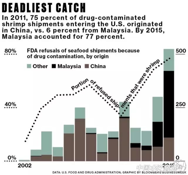 中國水產頻道報道,2016年12月15日,美國彭博新聞社發表文章,將輸美對蝦的抗生素殘留問題重新提上社會輿論的臺面。文章揭示了部分交易內幕:大量中國養殖的“藥殘”對蝦,經由馬來西亞轉口“非法”銷往美國本土。