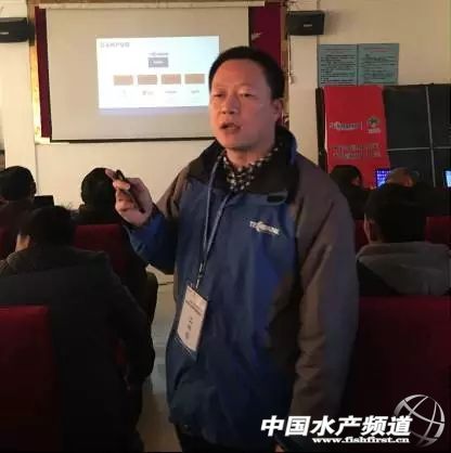 圖三:上海愛源沈剛梁總經理為大家分享大規格青蝦養殖技術及疾控管理措施 一、水體總硬度。即水體中主要表征為鈣、鎂等陽離子的總和。在德清地區,洛舍、干山區域的塘口總硬度普遍能達到120以上,在雷甸、新安、三合地區總硬度普遍為90,甚至只有60。當池塘青蝦大量脫殼時,塘口原有的鈣鎂離子含量是無法滿足正常脫殼需求的。 二、青蝦養殖關鍵在于“水中溶氧”。由于青蝦不耐低氧,所以增氧機要多開。有些養殖戶為了節省電費,把增氧機當做“救命機”,只在危急時刻開增氧機,一定要改變觀念,晴天中午開,晚上開,突下大雨開,刮西北風時開,氣壓低時開,水溫突變開(打破水體表面張力、打破水體溫躍層),增加溶氧。 三、最適pH值8.2—8.7。(1)8.2以下的水,是缺氧的水,水草容易出問題(藻類不旺,水體透明度高);(2)7.5—7.8之間的水,加再多的肥也無法把水肥起來;(3)9.0以上的水,特別是在下午甚至超過9.6,高pH值最直接的影響就是水體中氫氧根離子對鈣鎂離子及微量元素的絡合作用,導致蝦吸收鈣鎂離子及微量元素相對比較困難。 四、水體深度。塘口普遍在60-70cm水深,一旦出現大幅降溫的情況,如果水質偏瘦,水環境變化比較明顯這樣對青蝦的刺激更加明顯,可能導致青蝦強行脫殼。 五、飼料選擇。飼料成本在青蝦養殖中的成本約占30%以上,由于青蝦為雜食性水產動物,偏食動物性飼料,人工養殖以商品飼料喂養為主,飼料蛋白一般不低于35%。 天邦股份飼料事業部張兆峰總經理以“以食為天,應和立邦”為主題為大家介紹了德清地區的青蝦養殖情況和天邦全熟化青蝦料。