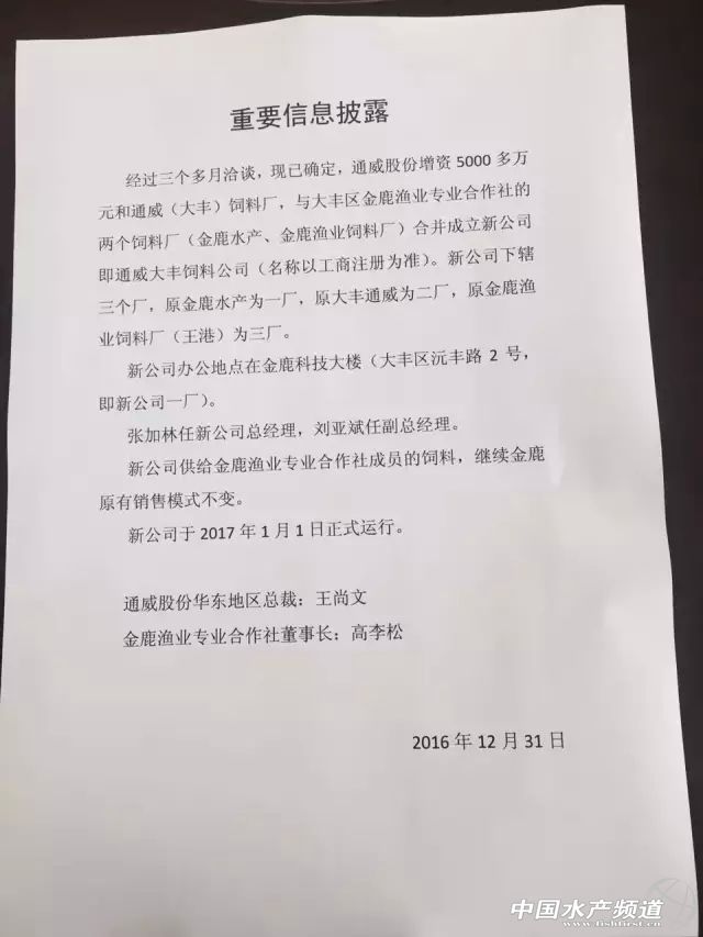 文/圖 水產前沿雜志 唐東東 12月31日,通威股份華東地區總裁王尚文、金鹿漁業專業合作社(簡稱“金鹿漁業”)理事長高李松聯合簽署重要信息披露,發文稱: 全文如下: 經過三個多月洽談,現已確定,通威股份增資5000多萬元和通威(大豐)飼料廠,與大豐區金鹿漁業專業合作社的兩個飼料廠(金鹿水產、金鹿漁業飼料廠)合并成立新公司即通威大豐飼料公司(名稱以工商注冊為準)。新公司下轄三個廠,原金鹿水產為一廠,原大豐通威為二廠,原金鹿漁業飼料廠(王港)為三廠。新公司辦公地點在金鹿科技大樓(大豐區沅豐路2號,即新公司一廠)。 由張加林任新公司總經理,劉亞斌任副總經理。新公司供給金鹿漁業專業合作社成員的飼料,繼續金鹿原有銷售模式不變。新公司于2017年1月1日正式運行。 通威股份總裁郭異忠接受《水產前沿》采訪時表示,與金鹿漁業合作是因為其運作模式與通威股份在做的漁光一體模式有相似的地方,只是前者缺水面的光伏;而養殖層面的做法,如以合作社方式去解決養殖戶所關心的資金、賣魚等問題,跟通威股份未來要做的事情相近。 據了解,金鹿漁業目前擁有7萬畝養殖水面,涉及養殖、飼料、金融、苗種、魚藥和水產品銷售六大業務板塊,是國內極少不靠政府項目經費來支撐的合作社,一度被稱為合作社的經營典范。高李松從1979年開始養魚,2005年注冊成立金鹿漁業合作社,是金鹿漁業的主要締造者,如今將一手打造的成果轉與他人,是出于怎樣的思考?筆者采訪了高李松,了解與通威股份合作的原因以及他的設想。 金鹿漁業專業合作社理事長高李松 水產前沿:能否描述一下與通威合作的過程? 高李松:蘇州通威因為環保問題停產之后,通威過來找我們談幫忙代加工,我說新廠的設備還沒調試好,就沒繼續談。后來陸續又談了兩三次,開始是說以大豐通威的名義參股成立合資公司,我覺得沒有達到我的要求,不能大豐通威是兒子,合資公司當孫子,兒子和孫子不在一個平臺上。我說要合作就真正合作,干脆談到底,把大豐通威(全稱為通威(大豐)飼料有限公司)和我們兩家飼料廠并起來成立一個合資公司,只能三家結合起來成立一家我就同意。應該說把自己的資產拿出來跟外面合作,這種方式在通威歷史上是沒有過的。不過,這事劉(漢元)主席知道后就批了,因為我們飼料廠十年前就用通威的預混料,他對我們也比較了解。 之后,通威股份的郭異忠總裁親自推進,包括通威股份副總裁、華東片區總裁王尚文也助推了合作的達成,給了很多建設性的意見。9月中旬我們雙方簽訂了合作的基本框架協議,我們的原則是在合作中求同存異,把談不攏的事情先擱置,統一的東西先談起來。另外,以后鹽城市場就歸合資公司經營,我們雙方都不能單獨在當地建飼料廠,要建飼料廠只能是以合資公司名義。 水產前沿:為什么會考慮跟通威合作? 高李松:從公司經營本身來說,我們發展得很好,飼料年銷量有6萬-7萬噸,很平穩?梢哉f,我們的資金、市場都很良性,要說瓶頸就是人才。我們這批人的層次還是低了,屬于草根班子,把企業帶到這個樣子,再往上攀一層就難度很大。之前也想過在外面找職業經理人,不好找;我自己也去上過幾期的MBA培訓課,但別人的東西始終是別人的。 我們辛辛苦苦把企業做到現在,也不容易,要給合作社的股東一個完美的交代,跟通威這種航空母艦型的企業合作我很放心,至少合作社的生命力有了,同時想讓我們內部的人員得到提升。當然不是說全部按通威的來,郭異忠總裁也說了以前好的管理模式繼續發揮,大家要把好的東西融合起來。 我提出本人不再在合資公司擔任任何職務,最多是參謀的角色,自己還是想把主要精力放在養殖環節?梢哉f,我從養魚起步,慢慢做了產業鏈,當把產業平穩交到合資公司后,再回到原點去養魚。(笑) 水產前沿:您覺得通威看中金鹿的哪些地方? 高李松:肯定不是單單看中我們飼料企業的資源,通威也講,如果是飼料廠合作就沒有必要,大家都是同行,合作可能就是1+1等于或略大于2的事情,我們要做就做1+1乘以2或乘以10的事情。 主要是兩方面,一個是我們飼料廠+合作社的產業鏈模式,通威也是看好這個,把養殖戶變成合作社的社員,飼料廠作為合作社的代加工企業。二是我們有7萬畝水面,有錢的養殖戶看能不能投“漁光一體”。不過現在養殖戶的池塘租期一般是5年,而投資光電需要20年以上的回收期,這方面需要通威跟當地政府談,看能否把租期延長。這兩點里邊,通威應該是更看好我們的合作社模式,想向全國推廣,因為通威拿水面也很容易。 水產前沿:飼料企業推合作社模式,有些是經銷商組織養殖戶成立合作社的方式。 高李松:這方面我跟通威也探討過,合作社經營里邊有一個核心問題,就是合作社承擔了什么,不僅僅是管理或是滿足養殖戶的一些需求,還要有利益驅動,所以我說必須在飼料廠里邊劃分一定的利潤分為合作社,像我們的飼料廠就是廣大社員的。 以我們和通威談的合作來講,合作社以后就屬于合資公司的下屬單位,但我們合作社要求在合資公司里邊占股49%,這里邊我不超過20%,還有相當一部分是分給社員,49%是代表合作社的廣大社員。只有有了這樣的利益驅動,社員才會跟著你走。另外,合作社還要有救助體系,因為養殖過程中總會出現問題。 水產前沿:您對合資公司有什么期待或建議? 高李松:希望合資公司三年能夠達到20萬