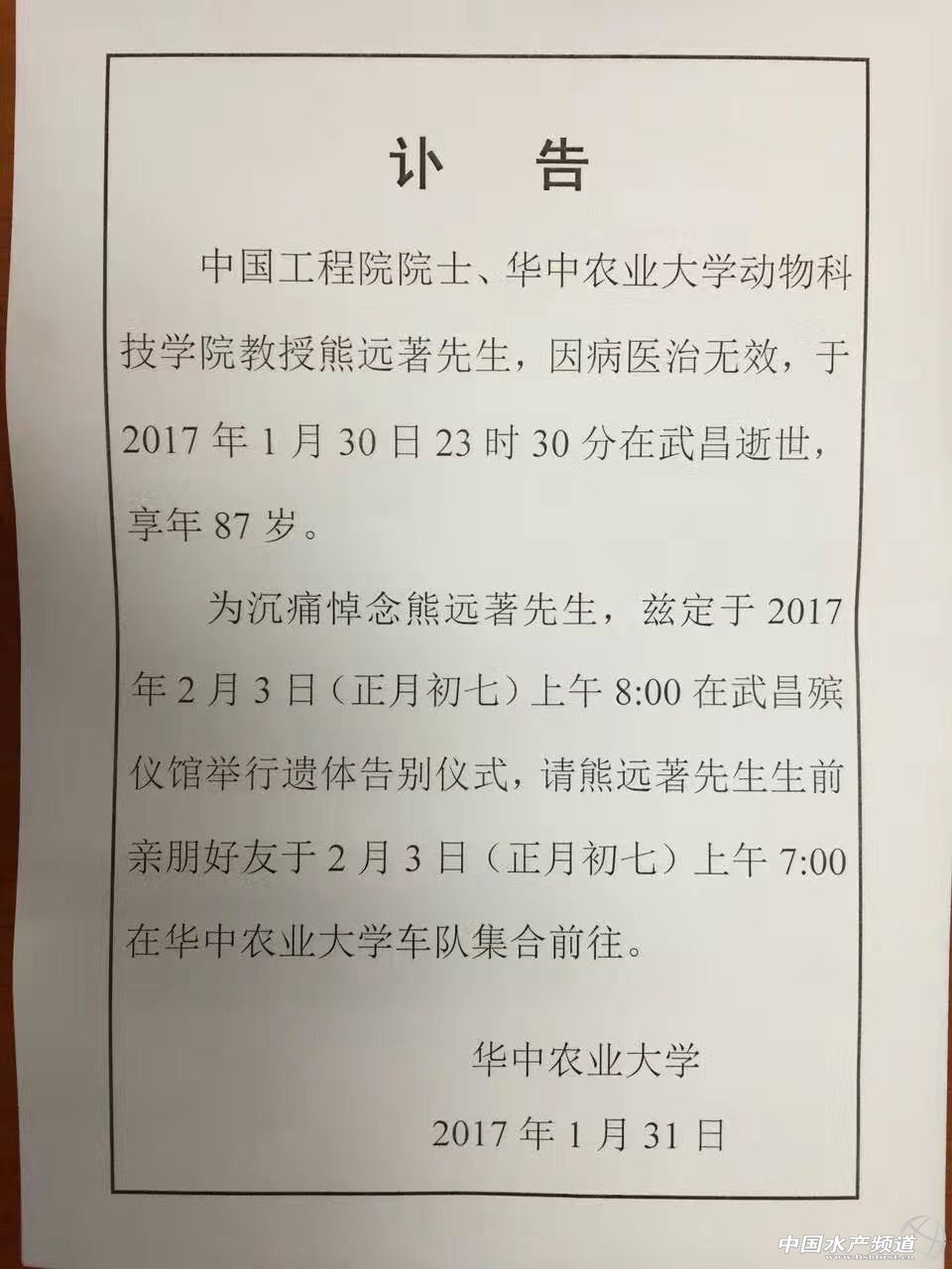 中國工程院院士、華中農業(yè)大學動物科技學院教授熊遠著先生 中國工程院院士、華中農業(yè)大學動物科技學院教授熊遠著先生,因病醫(yī)治無效,于2017年1月30日23時30分在武昌逝世,享年87歲。 熊遠著先生1930年7月生于湖北省竹山縣,1959年畢業(yè)于華中農學院,1999年當選中國工程院院士,是我國著名的動物遺傳育種學家。 熊遠著先生生前曾任國家家畜工程技術研究中心、農業(yè)部種豬質檢中心、農業(yè)部豬遺傳育種重點開放實驗室、中國武漢種豬測定中心主任。兼任中國畜牧獸醫(yī)學會常務理事、養(yǎng)豬學分會名譽理事長、湖北省畜牧獸醫(yī)學會名譽理事長,國務院學位委員會學科評議組成員,農業(yè)部畜牧專家顧問組成員,第七屆、八屆全國人大代表。曾獲得有突出貢獻的國家級專家、全國高等學校先進科技工作者、全國星火先進工作者、湖北五一勞動獎章、“九五”國家科技攻關突出貢獻者、“何梁何利”科學與技術進步獎等多種榮譽和獎勵。長期致力于動物遺傳育種特別是豬遺傳育種的教學和科研工作,先后主持了國家及省部級重大科研項目30余項,獲國家科技進步獎5項,省部級科技進步獎10余項。先后再國內外重要學術刊物和會議上發(fā)表論文230余篇,主編專著4部,培養(yǎng)博士研究生40余人,碩士研究生60余人。 熊遠著先生學術造詣深厚,治學嚴謹,為人師表,甘為人梯,為我國畜牧學科的發(fā)展和人才培養(yǎng)做出了重大貢獻,在國內外學術界享有崇高聲譽。 我們謹此沉痛悼念先生,并向先生的親人致以最深切的問候! |