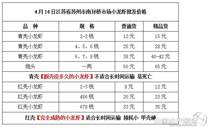 中國水產頻道獨家報道,據網友提供消息,2017年4月14日江蘇南環橋市場小龍蝦批發價格如下: 江蘇南環橋市場小龍蝦批發價格信息由江蘇省蘇州市南環橋市場雜魚區29號<君樂小龍蝦>(電話:13222277503張先生、 17152546669劉先生 微信訂貨:18040020068)提供,由于價格波動及訂貨量影響,以上價格為收購價格,實際價格請聯系電話。 |