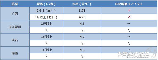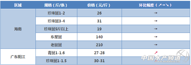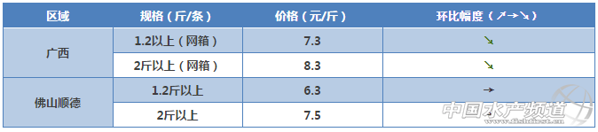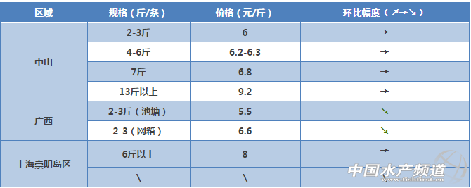 文/圖 粵海飼料集團、水產前沿吳佳輝 羅氏沼蝦 肇慶金渡白土區域:存塘量少,出蝦較少,價格上漲。 中山區域:羅蝦存塘量少,出蝦較少。 浙江嘉興區域:今年苗種價格比較高,現在基本在480元一萬,現在苗場出苗量少,苗緊張,所以較上個星期漲價30。 海鱸 廣東珠海區域:市場存塘魚少,1.7斤規格魚缺魚,提價收魚。 福建莆田、東山、詔安區域:鱸魚養殖存塘魚主要為1.6斤以上魚,大規格鱸魚難賣。市場銷售活魚主要規格在1-1.2斤規格,隨著市場規格鱸魚(1-1.2斤)存塘量減少(不足2成),規格鱸魚價格略有上漲,每斤較上周上漲0.5元。 金鯧魚 廣東湛江區域:近期1斤左在規格存魚較少.價格略升;湛江區市郊金鯧魚苗放苗1600萬尾.比例3-4成。 廣東陽江區域:目陽江本地存排金鯧魚規格小(4-7兩),未達到上市要求,銷售的成魚都是從海南船運過來,同時因為離珠三角較近,客戶更愿意從陽江收活魚,所以活魚價格比湛江的略高,但是活魚受湛江市場競爭的影響,價格未見上漲。陽江港金鯧目前放苗約1500萬尾,比例3成。 廣東潮汕區域:廣東潮汕市場上無成品魚,無價格參考。 廣西區域:客戶過冬魚基本出完趕放苗,隨著過冬魚存量大幅度減少,本周金鯧魚0.8-1斤/條冰鮮價格上漲0.3-0.5元/斤,凍品金鯧價格依舊低迷,400/500克:11元/斤;500/600克:11.8元/斤。 海南區域:海南金鯧過冬魚已經快賣完,現比較缺8兩左右的活魚,所以價格較好,但1.2斤及以上的打冰鮮,受到凍庫魚的影響,價格一直漲不起來;目前海南已投苗約5千萬尾,占三成。 生魚 廣東順德區域:順德15年舊魚存塘量不多,新魚規格相對偏小,出魚較多,價格相對降低一點。 黃顙魚 廣東佛山區域:目前黃顙魚存塘量不多,西樵存塘量1-2成,三水存塘來量4-5成,最近出魚較多,2.8-3兩多居多,放苗1-2成,最近價格波動不大,未來幾天價格相對平穩。 廣西區域:市場需求量大,價格堅挺,大規格魚微漲。 羅非魚 廣西區域:存魚量少,凍廠開工不足,搶收魚,價格波動大,本周微漲。 湛江雷州區域:過冬大魚持續出魚而存塘少,過冬中小魚還沒達規格,致價格穩定。 草魚 中山區域:存塘量相對少,價格在高位持平。 廣西區域:氣溫上升,草魚不耐長途運輸,價格有所下滑。 上海崇明島區域:崇明島區草魚現在是有史以來價格最高的一年,現在養戶還在等待價格上漲,后期應該價格維持現狀。 石斑魚 海南區域:主要是蝦塘養殖石斑,規格不一,目前存塘量不好估計,市場需求不旺,價格變動不大;放苗約有3成。 陽江區域:現在石斑存魚少.魚價上漲.放苗量3-3.5萬尾。 叉尾 廣西區域:近期叉尾病害多,出魚量較大,魚販壓價,對整體價格有所影響,本周叉尾價格下跌0.4-0.7元/斤。 泥鰍 廣東中山區域:目前泥鰍出魚較多,價格相對較低。 黃鰭鯛 其他品種 加州鱸魚:佛山區域目前存塘量較少,預計價格繼續上漲,受成魚的影響,水花漲價。 大黃魚:福建寧德、霞浦區域同比上周價格基本保持穩定,市場行情穩定。 虎紋蛙:海南區域存蛙少,蛙市轉暖;澄海區域牛蛙由于市場去年養殖的成品蛙賣完,新蛙未達到上市規格,牛蛙市場出現空白,蛙價無明顯變化。 【關鍵字】:沼蝦 海鱸 價格 水產養殖 |