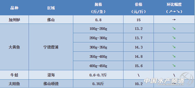 文/圖 粵海飼料集團、水產前沿 吳佳輝 羅氏沼蝦 肇慶金渡白土區域:存塘量較少,放苗量1-2成,出蝦較少,價格略有上漲。 中山區域:存塘量2成左右,市場出蝦量少,價格有所上升 浙江嘉興區域:今年苗種價格比較高,目前由于供不應求,價格達到500-520元一萬,現在苗場出苗量少,苗緊張,所以較上個星期漲價30。 海鱸 福建莆田、東山、詔安區域:鱸魚養殖存塘魚主要為1.6斤以上魚,大規格鱸魚難賣。市場銷售活魚主要規格在1-1.2斤規格,隨著市場規格鱸魚(1-1.2斤)存塘量減少(不足1成),規格鱸魚價格穩定。 潮汕:市場上無成品魚,無價格參考。 金鯧魚 陽江區域:本地金鯧開始上市,預計價格逐漸有下跌趨勢。 湛江區域:近期1斤左右金鯧魚較少,價格略漲;湛江區市郊金鯧魚苗放苗1900萬尾,比例6成 粵東潮汕區域:市場上無成品魚,無價格參考 廣西區域:目前北海鐵山港投苗44萬尾,占早投苗的7成,全年的5成。 海南區域:海南金鯧過冬魚就剩三亞還有少部分,現比較缺8兩左右的活魚,所以價格較好,但1.2斤及以上的打冰鮮,受到凍庫魚的影響,價格一直漲不起來;海南金鯧目前投苗8千萬尾,占比8成 生魚 佛山順德區域:目前生魚存塘量少,價格有所上漲 黃顙魚 廣東佛山區域:目前黃顙魚存塘量不多,西樵成魚存塘量不足1成,開塘放苗養戶增加,本月放苗持續增加;三水存塘來量3-4成,放苗1-2成,最近價格較為平穩,未來幾天價格持續穩定。 浙江湖州區:現在出魚少,價格比較穩定。 羅非魚 廣西區域:存魚量少,凍廠開工不足,走市場的魚價相對好很多,1.3斤以上5.1-5.3元/斤。 華南其它區域:目前羅非魚達上市存塘量很少,保持目前價格沒問題;過冬中小魚(2-6兩)還有部分存塘量,正在加快喂料促長中;春苗剛投放。 草魚 中山區域:草魚進入養殖高峰期,存塘量小幅上升,價格略有下降 石斑魚 海南區域:雖然需求不旺,但是近期石斑魚上市較少,價格穩定;放苗約有3成 湛江區域:現在石斑魚存魚少,魚價較好 陽江區域:比上周下跌0.5元 叉尾 泥鰍 中山區域:只有少量存塘泥鰍,整個市場總體的養殖情況來說,約7成左右虧本,賺錢的不超過2成。 其他品種 加州鱸魚:佛山區域目前成魚存塘量較少,受成魚價格的影響及放苗末期,水花產量較低,價格有所上漲。 大黃魚:福建寧德、霞浦區域大黃魚市場價格略微有波動,同比上周價格下跌0.1-0.3元/斤,基本保持穩定 牛蛙:澄海區域去年養殖的成品蛙賣完,新蛙未達到上市規格,牛蛙市場出現空白,蛙價無明顯變化。 太陽魚:佛山順德區域整體成魚存塘量下降,杏壇存塘量低,本月逐步開塘,本月勒流成魚流通量加大,市場需求平穩,價格持續穩定。 【關鍵字】:生魚 海鱸 羅氏沼蝦 水產養殖 |