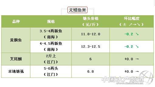 文/圖 珠海海龍、水產前沿 吳佳輝 養好魚,更要賣好魚 珠三角地區最新魚價行情一手掌握 草魚 存塘量少,價格全面上漲 草魚種板塊由于新魚對接不上,舊魚存塘少,客戶出魚積極,價格在新魚大量上市之前都會比較好;超市魚板塊,由于魚種價格高,客戶賣魚補苗積極性差,市場存塘少,價格維持在高位。大草魚和脆肉鯇由于流通順暢和市場供需平衡,價格穩定,波動不大。 黃顙魚 外圍上市量增多,本地價格回落 黃顙魚出塘魚價近期有所回落,雖然存塘量越來越少,但由于省外黃顙魚市場已經開始大量上市,南下抓魚的越來越少,導致魚價行情有所下跌。 海水魚 存塘少,需求增,級魚價格上漲 鱸魚級魚存塘量不斷減少,市場需求增加,價格處于高位,水車抓至1.4斤,進而拉動大魚魚價上揚,后續總體趨勢上漲,級魚、大魚后市繼續看好上漲;黃花大魚存塘多,級魚價格回升,大魚價格暫處于低位,后市看漲;立魚大魚需求穩定,但大魚存塘增加,開始供過于求,后市預計微跌,暫處于高位。盲曹存塘及出魚穩定,預測后續趨勢穩定。 |