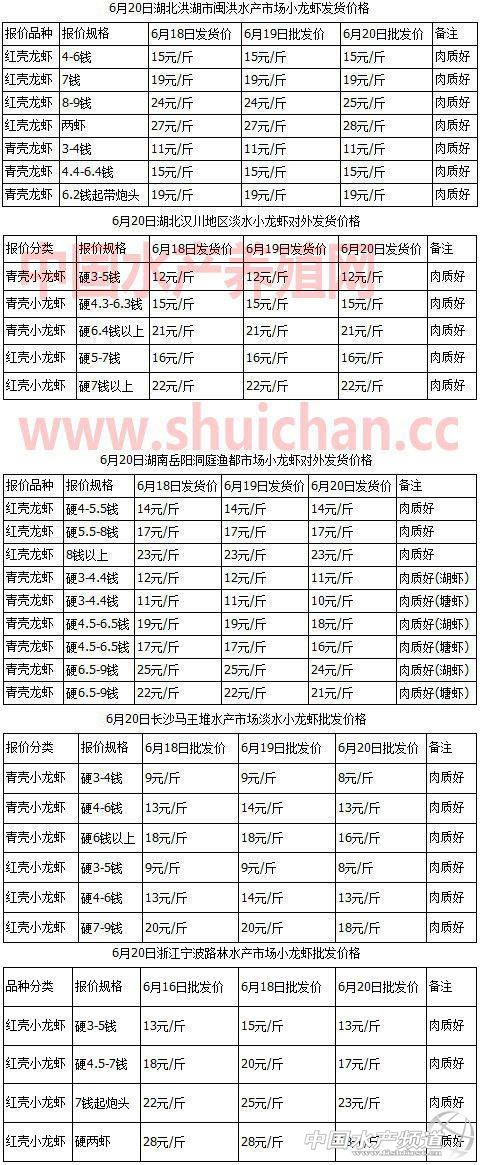 中國水產頻道報道,今天湖北湖南等主產區沒有下雨,小龍蝦上市量還可以,不過外地市場老板要貨情況不算好,一方面跟周一到周三習慣性低迷有點關系,另外長三角地區本來是靠湖北湖南等地貨源支撐,現在江蘇等本地小龍蝦也開始陸續上市了,對外省的貨源的依賴度沒有之前那么高。湖北地區小龍蝦加工廠的采購需求還是比較旺的,小規格龍蝦剝蝦仁,大規格紅殼龍蝦做整肢蝦,近期大規格龍蝦有些缺貨,工廠催貨比較急,價格有所上漲。未來幾天長江中下游沿線地區降雨又要開始了,小龍蝦市場交易情況多數又要受到影響。鄱陽湖今天12點正式開捕,明天鄱陽湖小龍蝦等優質水產品會陸續進入很多市場流通。以下是6月20日中國水產養殖網小龍蝦直通車湖北武漢洪湖漢川監利、湖南長沙岳陽、安徽六安蕪湖合肥、江蘇興化無錫、上海等地小龍蝦價格播報。 |